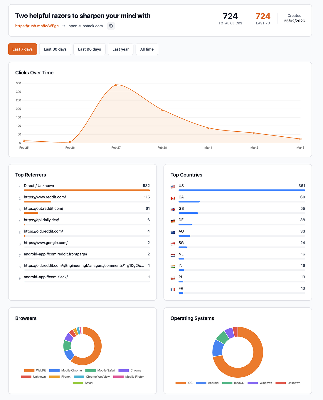 Building and launching a product in one month. Worth it?How a minor itch led me down the rabbit hole of building and launching a product in an unsexy space. How I turned that into an experiment and my first observations on the results.Today’s article is the story of a giant rabbit hole, or how a rather simple need turned into a month-long quest, adventure, time drain, or massive waste. The jury is still out to evaluate the results, but nevertheless I’m here to share the story with you, my beloved readers. This is the story of Rushomon, something you didn’t know existed until about 5 seconds ago. Its existence is unlikely to change your life, but the story of its making might. But let’s go back to about a month ago, on February 1st. The originsI remember an old commercial, though I do not remember the product it was advertising. It depicted a man who was looking to accomplish a trivial task, but ended up fixing his entire house, as they encountered more and more issues to solve on the path: fixing a drawer, oiling a squeaking door, etc. Similarly, after procrastinating for months, at the end of January I finally decided to work on a task I had neglected for long: setting up a self-hosted URL shortener service. I’ve already shared in previous articles that I’m making inroads in the self-hosted space. What I haven’t shared with you is just how awful Substack traffic statistics are. ‘Bad’ is too kind. They’re worthless. And the worst thing: they haven’t visibly improved in the last few years. I guess the staff is too busy adding unnecessary “social” features to care for the basics of a blogging platform, so I needed to do something about it. The main reason: I do share links to my articles in a few places, and I’m always interested in knowing which channel performs better, i.e., which channel is bringing in the most traffic. That’s not the goal in itself, of course. The goal is to know where to invest my time and energy to promote the newsletter. So, a simple task: just look at one of the handful of available options for open-source services, install it, and use it. Not so fast. While I was going through the tedious process of vetting existing solutions based on stack, requirements and functionalities, I got hit by the disease commonly found among software engineers: the NIH syndrome¹. And like anyone else afflicted by it, I made up perfectly reasonable arguments to sustain the idea that it would have been obviously better if I built my own solution. Those included the following: