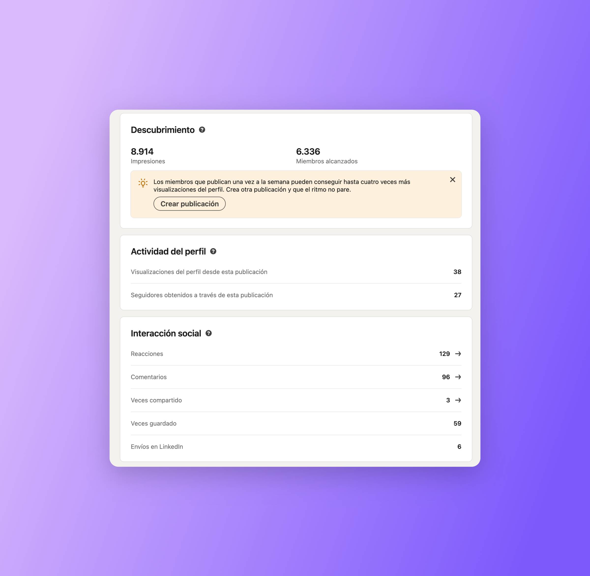 Estos son los datos del post en LinkedIn. No es ninguna locura, pero sí métricas bastante mejores de lo habitual.