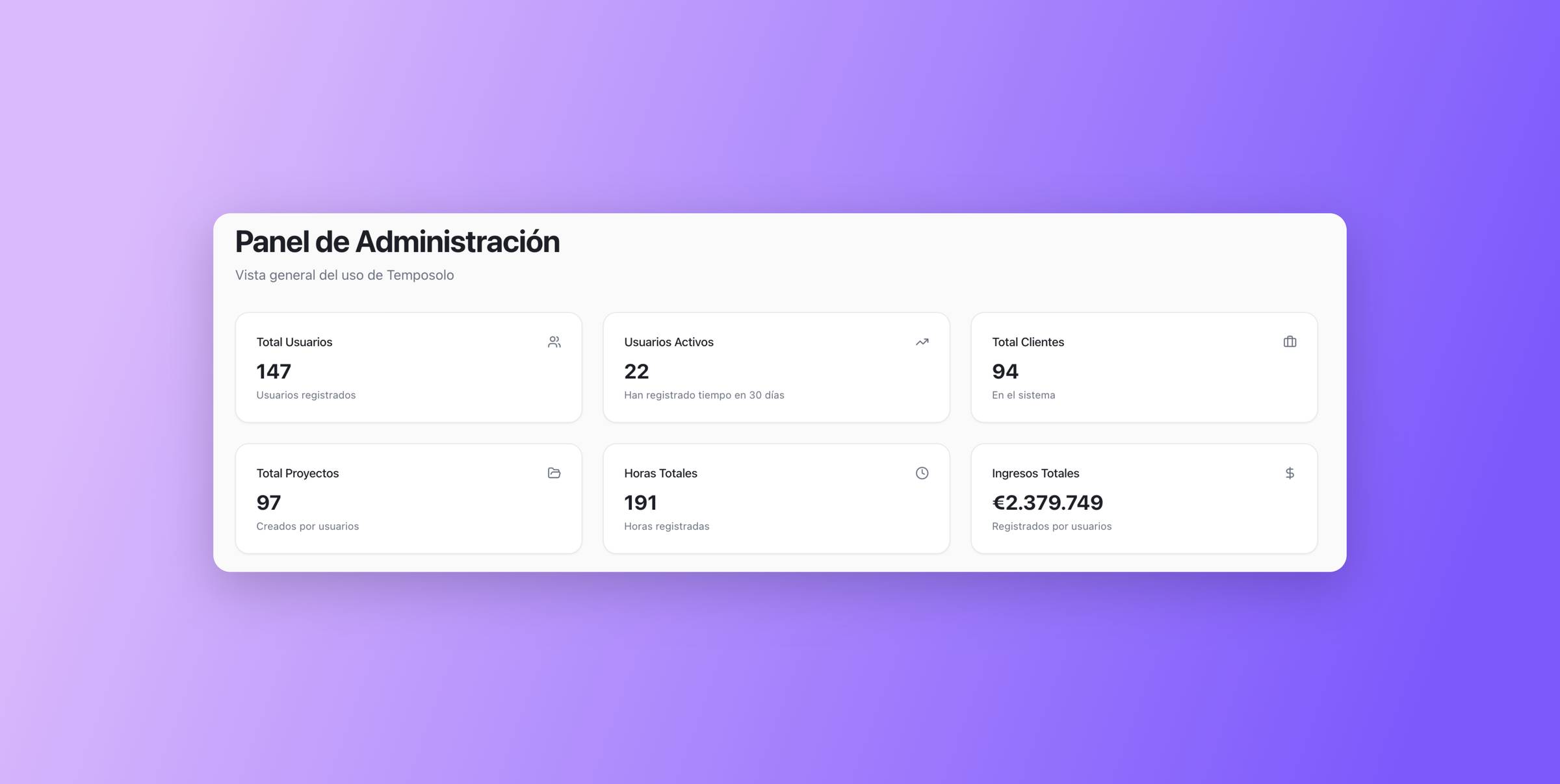 En cuanto al backend de TempoSolo, estos son algunos datos. Se han registrado 147 personas y, de ellas, 22 están usando y trasteando la herramienta de verdad. Se han creado 94 clientes, 97 proyectos y una facturación conjunta de 2,37 millones.