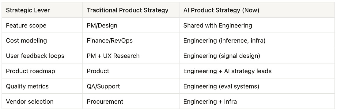 This is AI system design and it’s not optional. Without it, you ship generic features that are expensive to run, easy to copy, and hard to trust. Where Strategy Used to Live vs. Where It Lives NowIf you don’t step up to shape these, you’ll be stuck reacting to decisions made without your input, cleaning up systems you didn’t design, and scaling products you don’t trust. And one of the most dangerous parts of AI infrastructure is this: