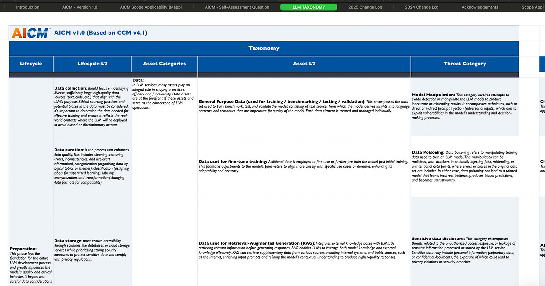 As you can see, the AICM Control Domains are both robust and diverse, covering a combination of people, process and technology, as well as both underlying infrastructure and core application security concepts while also accounting for novel aspects of AI, such as Model Security. AICM Self-Assessment QuestionsThe AICM Self-Assessment Question tab is helpful as it lays out the controls discussed above and provides a library of self-assessment questions so organizations can conduct self-assessments to identify where they are meeting AICM controls (and controls in the other frameworks it maps to) and where they gave gaps they need to document and remediate at a future date. LLM TaxonomyThe LLM Taxonomy is also helpful as much of the lexicon around LLMs and AI may be new to organizations, security practitioners and the assessment and audit community. Phrases such as Retreival-Augmented Generation (RAG), Fine-Tuning, Data Poisoning, Model Manipulation and more. Tying It All TogetherAICM represents another great contribution to the Cyber community from CSA and ties into the CSA ecosystem of other resources as well. For example, they shared they launched their “STAR for AI Program” where organizations can demonstrate a commitment to trustworthy AI and even achieve a third-party validation of organizational alignment with AICM. They also offer an AI Trustworthy Pledge organizations can make. While not currently required by regulatory frameworks and regimes, AICM represents a robust and coherent approach to helping organizations implement AI securely and a repeatable and scalable way for assessors to measure that. It’s ability to tie together the various leading frameworks from a mapping perspective also makes it a great resource for organizations to measure their maturity across leading AI frameworks in an effective manner. Great work by the entire AICM and CSA teams who contributed to this resource for the community! Resilient Cyber is free today. But if you enjoyed this post, you can tell Resilient Cyber that their writing is valuable by pledging a future subscription. You won't be charged unless they enable payments. |