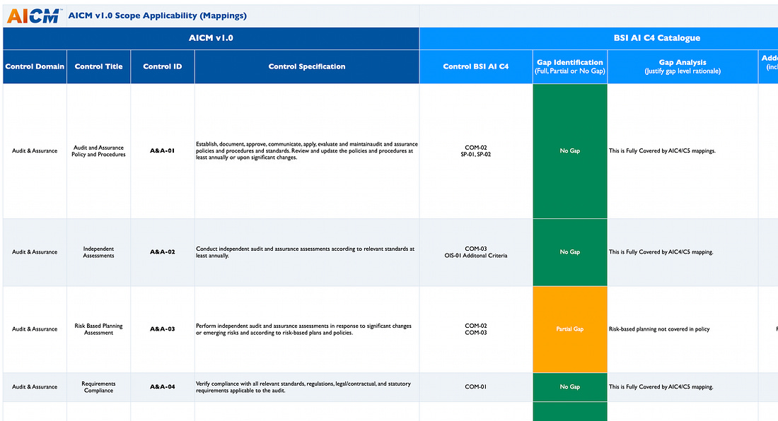 The CSA also released a presentation introducing AICM: At the AICM landing page you can download an “AICM Bundle”, which I did, and it includes an AI-CAIQ of AICM (Questionnaire), mappings of AICM to BSI AI C4 and AICM to NIST 600-1, as well as AICSM v 1.0 itself. AICM includes 243 controls structured across 18 domains. When you open AICM you can see the various taps, such as Introduction, AICM v1, Scope Applicability, AICM Self-Assessment Questions, and more. Below is a snapshot, where you can see Control Domains, Titles, ID’s, Specifications, Type and more. You can see how some controls are Cloud & AI Related, while others are strictly AI Related. Additionally, they help break down the typical control applicability and ownership, with some being owned by the model provider whereas others for example may be shared by the owned by the AI customer and some are shared, much like the Cloud Shared Responsibility Model prior to AI’s widespread adoption. AICM Scope/MappingAnother tab in the AICM sheet is the AICM Scope Applicability (Mapping) tab, which is helpful if you’re organization has or will need to align with and implement other frameworks such as BSI AI C4, NIST AI RMF etc. It lays out what AICM controls have no gaps with mapping to other frameworks, and which ones either are a full or partial gap, as you crosswalk your compliance and alignment across the various frameworks. AICM Control DomainsPersonally whenever I see a new control framework, I like to get a look at the control domains that it involves, to understand how it groups controls as well as what the scope of the overall framework is. Let’s take a look at the Control Domains from AICM
