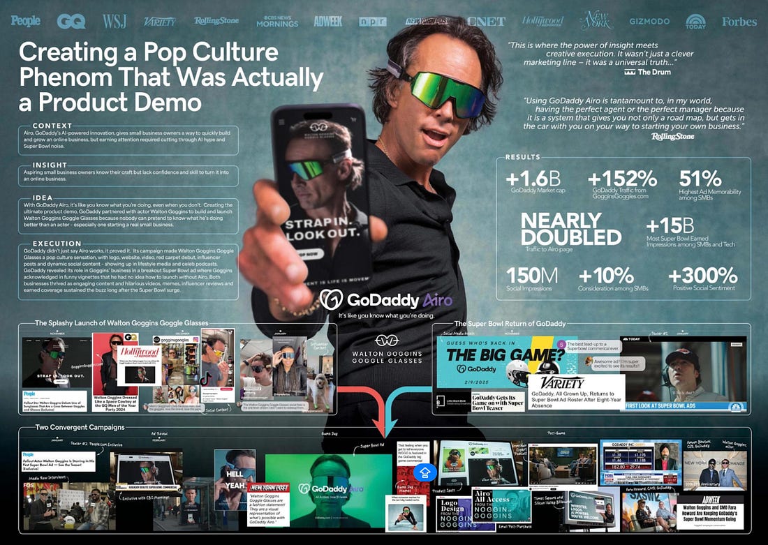 All this was activity surrounding the main event, Cannes Lions, the Super Bowl of creative marketing, which has only recently (2024) started spotlighting B2B campaigns. And the real headlines this year? For me, it wasn’t the conference itself (so don’t worry if you didn’t attend), it was the award-winning B2B campaigns that stole the show. The Goggins & GoDaddy CampaignLet’s go back in time: it's mid-January 2024, and HBO officially reveals the cast for The White Lotus Season 3. Fans are buzzing as it's been over a year since Season 2 wrapped, and anticipation is reaching fever pitch. Among the new cast is Walton Goggins, already celebrated for roles as Shane Vendrell in The Shield and Boyd Crowder in Justified. With the world watching, GoDaddy had a brilliant idea. CMO Fara Howard, Director of Brand Marketing Rachael Powell, Executive Creative Director Adam Nowak, and their teams, alongside agency Quality Meats, got to work. Fast forward to November 2024: Goggins launches Goggins Goggles, a real, buyable eyewear line complete with an e-commerce site built entirely using GoDaddy Airo: domain, site, logo, order emails, everything. The launch perfectly leveraged the growing buzz around his White Lotus role. Goggins Goggles were mentioned on every late-night show, in every magazine article, and every press interview, making GoDaddy the center of the largest series launch of the year. Then came the centerpiece of it all: a Super Bowl ad titled “Act Like You Know”, aired on February 9, 2025. In the spot, Goggins plays multiple comedic personas before revealing he used GoDaddy Airo to launch his eyewear business. It's a brilliant celebrity-anchored B2B case study delivering marketing authenticity at his career’s peak. And the accolades followed swiftly: at Cannes Lions 2025, GoDaddy won the Creative B2B Lions Grand Prix, the top prize. The jury praised its “boldness, confident execution, and pure B2B creativity,” calling out how it used humor and real results to prove AI tools not just work, but thrive in a B2B context. Why This Campaign Should Be Required B2B Viewing