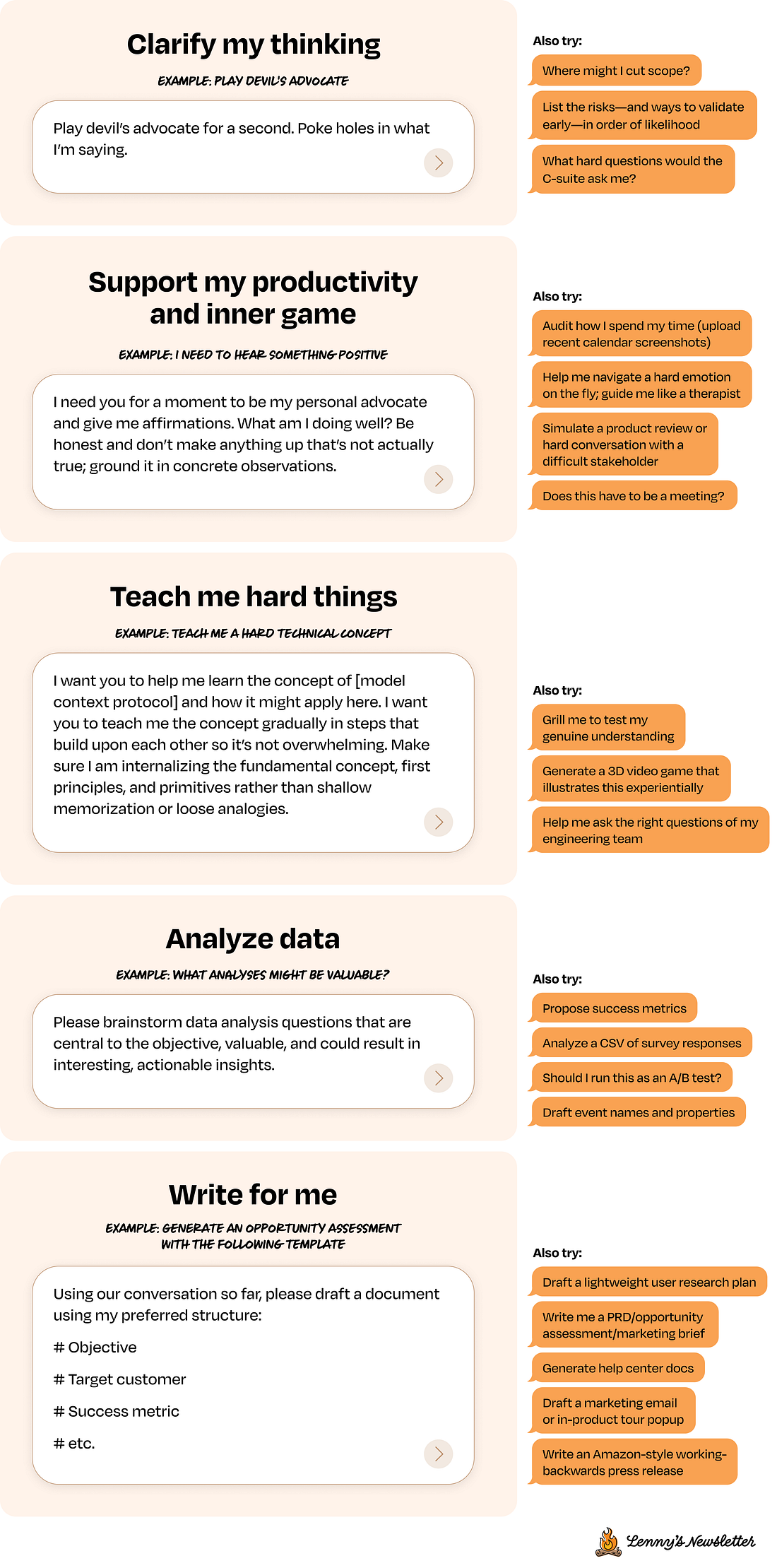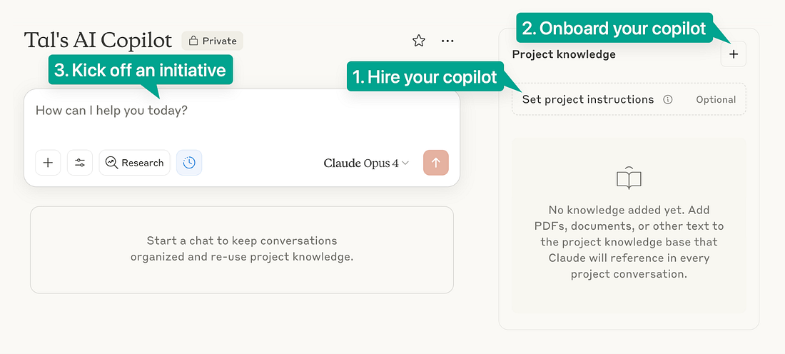 Build your personal AI copilotA guide to using AI as a long-term thinking partner (including prompts to get you started)👋 Welcome to a ✨ free edition ✨ of my weekly newsletter. Each week I tackle reader questions about building product, driving growth, and accelerating your career. For more: Lenny’s Podcast | How I AI | Lennybot | Lenny’s Reads | Courses | Swag If you’re not a subscriber, here’s what you’ve been missing: Annual subscribers now get a free year of Bolt, Perplexity Pro, Notion, Superhuman, Linear, Granola, and more. Subscribe now. One of my favorite collaborators, Tal Raviv, is back with another incredible piece that will change how many of you operate at work. If you’re looking for the promised AI productivity gains everyone’s talking about, start here. P.S. You can now also listen to these posts in convenient podcast form: Spotify / Apple / YouTube. For more from Tal, check out his upcoming free lightning lesson on how to use Cursor as a PM copilot, his free recordings of advanced copilot use cases, and his “Build Your Personal PM Productivity System & AI Copilot” course coming up in September (use LENNYSLIST for $100 off). You can also book Tal for one-day team workshops with your team. Here’s my embarrassing story: 11 months ago I wasn’t using AI at work—at all. My team and I were building AI products used by tens of thousands of people. But when it came to using AI in my own job, I was a proud Luddite. I didn’t want to sound like “the average of the internet.” I was worried that if I let AI tools do things for me, I’d lose my edge. When I tried using ChatGPT, I found it disappointing for strategic and innovative work—like consulting a chatty Wikipedia. Deep down, I felt discouraged that I didn’t know the exact magic spells of prompting that only influencers seemed to know. Then my engineering team kicked off a new, paperwork-intensive version of Scrum for a large initiative that required me to write dozens of detailed user stories. I couldn’t keep up, and all of a sudden I became my team’s bottleneck. I did what any experienced product manager would do: I whined and complained. Eventually my eng manager, Oleksii, took pity on me and showed me how to write detailed, near-perfect user stories with ChatGPT (which I covered in my discussion on Lenny’s Podcast!). Oleksii instructed me to (1) paste in an example template of a user story and (2) use speech-to-text as I blabbed on and on about how the product experience should work. I also ended up dictating the background story of the initiative to ChatGPT, just like I would at a team kickoff. ChatGPT replied with user stories that were concise, thoughtful, and airtight. The edge cases were extremely relevant, as if it had been a member of the team for months. Not only did the results translate my ramblings to engineering’s structured template, but each user story also included stipulations (mobile responsiveness, accessibility, pricing tiers) that I’d often forget. The results were nearly perfect, and my fingers never even touched the keyboard. ChatGPT was exhibiting superpowers I didn’t know existed. I had a hunch that mere user stories were just the beginning of how I could use it at my job. Could AI help me with higher-level tasks? Could it answer the ultimate question of knowledge work: What is the most important thing I should do next? I realized that AI tools had felt like blunt, generic instruments because I wasn’t providing enough context. LLMs can be highly effective for intelligent knowledge work, but only when we provide them with the same background knowledge that any person would need to do the same work. Recent advances in LLMs allow us to maintain (and grow) this context over time and across conversations, the same way we might keep a colleague in the loop. And we can even instruct LLMs to use consistent behaviors, values, and guidelines for interacting with us. When LLMs have this valuable and ongoing context about our goals, our role, our projects, our team, and our wider org, they become our “AI copilot”—a real thinking partner for long-term, complex work. Remember my fear of losing my edge? When we treat LLMs as partners that inspire rather than replace our thinking, our output only gets sharper. An AI copilot might be the least “agentic” way of using AI, and that’s the point. As AI tools proliferate and become more capable, our AI copilot is there to support us and make us better at our jobs. An AI copilot can work with us, not just for us. And that can make all the difference. Over nearly a year now, I’ve taught workshops to more than 20,000 tech employees and founders on how to leverage AI for complex, innovative tasks at work. I can confirm: regardless of company size, vertical, or fluency in AI, many tech workers today are missing out for the same reason I was. They’re not giving LLMs the context needed to experience their full potential. Below, I’ll share how to change the way you think about working with AI, and how to practically construct your own AI copilot. What are AI copilots good for?Leveraging a copilot isn’t about AI producing perfect answers—it’s about getting the most out of ourselves. Daniel Kahneman won the Nobel Prize in economics for his collaboration with Amos Tversky, and I love his reflection: “I am not a genius. Neither is Tversky. Together, we are exceptional.” After we work together to build AI copilots, my students start using LLMs to help them make strategic decisions, brainstorm roadmap ideas, develop their soft skills, and even support them emotionally. Their copilots challenge their thinking, analyze data, apply decision frameworks, prioritize, and help rehearse hard conversations. AI copilots also make it infinitely easier to vibe code an AI prototype, run meaningful data analysis, launch an AI automation, generate AI slide decks, and insert-AI-tool-we-don’t-even-know-about-yet. Because 