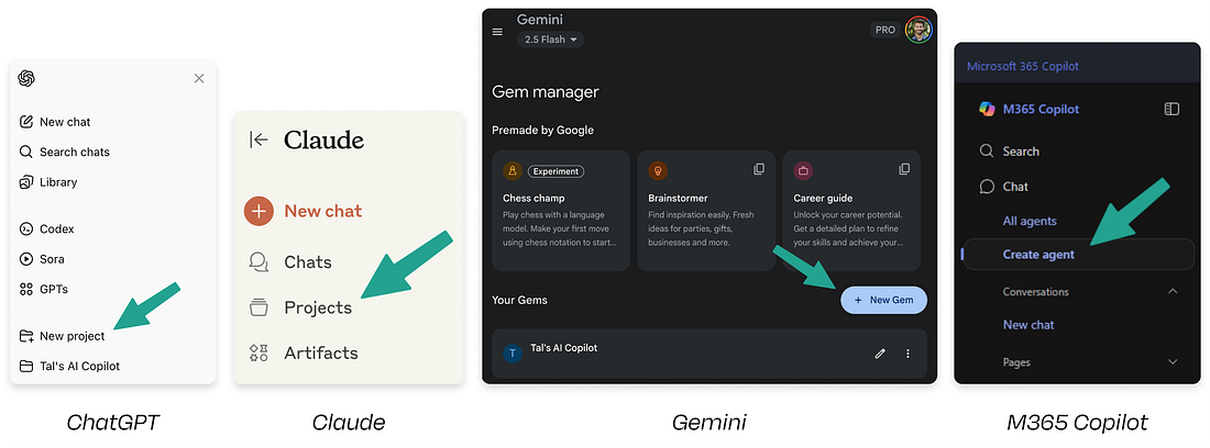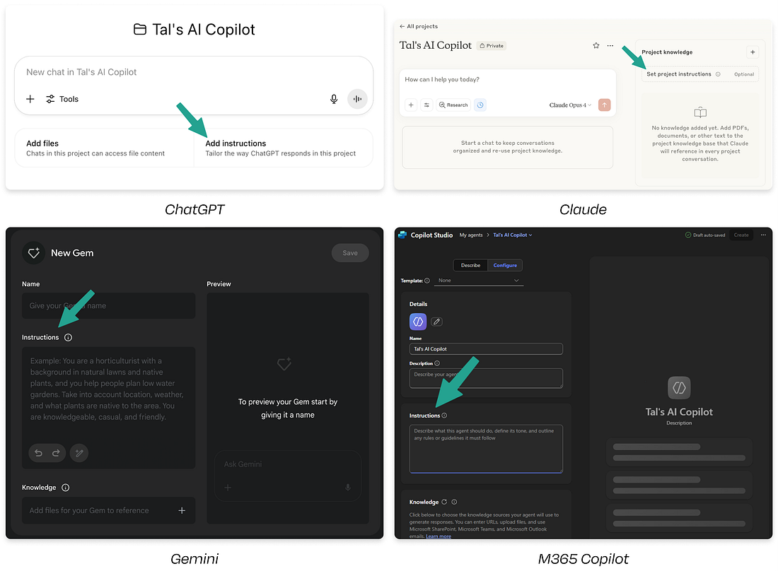 With this framework in mind, open your favorite LLM (upgrade to paid if you haven’t already), navigate to Project/Gem, and let’s get hands-on. What if your LLM at work doesn’t have projects? No worries, I’ve included a workaround for you at the end of this post. Step 1: “Hire” your AI copilotThe first step is to create a new project. I’m naming mine “Tal’s AI Copilot.” Don’t worry about giving it a description. Inside our project, we’ll “hire” our thinking partner by deciding what values and behaviors we want it to have. Like when selecting a colleague or a coach, we’ll choose traits that transcend the initiatives we’re working on, company strategy, or what quarter we’re in. Projects allow us to do this by defining instructions. Think of these as the “super-prompt” that the LLM applies throughout the conversation, slightly stickier than any prompts you type into a chat conversation. (If you’ve worked on an AI product, you might recognize this as extending the “system prompt.”) To get you started, copy and paste the following prompt into your project’s instructions. Make sure to fill in the placeholders with what’s relevant to your role: