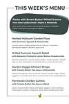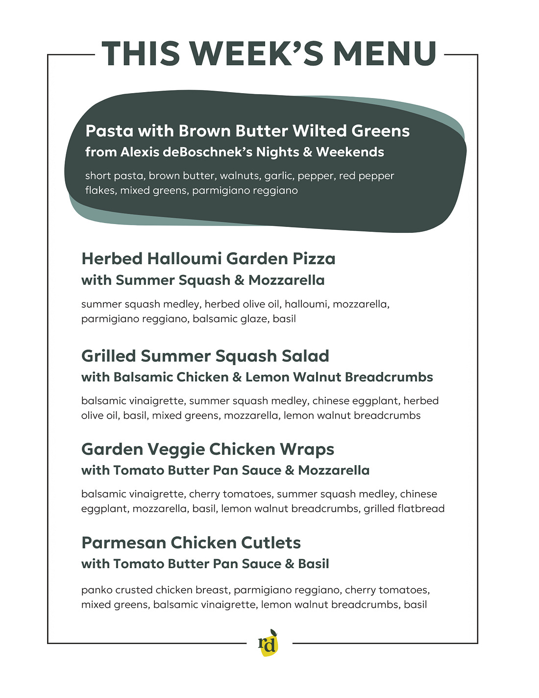 Herbed Olive OilOur Herbed Olive Oil this week was inspired by the bread dipping oil that you’d see at a restaurant offering free bread service. As noted on the instructions, if you don’t have all of the included dried herbs (Rosemary, Thyme, etc), please feel free to substitute with Italian Herb Seasoning or something similar. Tomato Butter Pan SauceFor the utmost freshness, we’re skipping the preparation of the tomato butter pan sauce this week and making it before serving. It comes together quickly and isn’t that fussy of a sauce; however, if you’d like to save some time on the final day of dinner (Parmesan Chicken Cutlets), feel free to make a big batch of the sauce at once, use half of it upon making it, then store the remaining half for the following day. Additional Prep NotesProtein Substitutions/AdditionsFor the Pasta with Brown Butter Wilted Greens… For the Herbed Halloumi Garden Pizza… For the Grilled Summer Squash Salad… For the Garden Veggie Chicken Wraps… ➕ Halloumi For the Parmesan Chicken Cutlets… Additional SubstitutionsDried Herbs 🔄 Italian Seasoning Summer Squash 🔄 Roasted Bell Peppers Cherry or Grape Tomatoes 🔄 Any Alternative Tomato Type Chinese Eggplant 🔄 Italian Eggplant (sliced into quarters) Walnut 🔄 86 ElementsBreadAll-Purpose Flatbread DoughUtilized in Herbed Haloumi Garden Pizza, and Garden Veggie Chicken Wraps