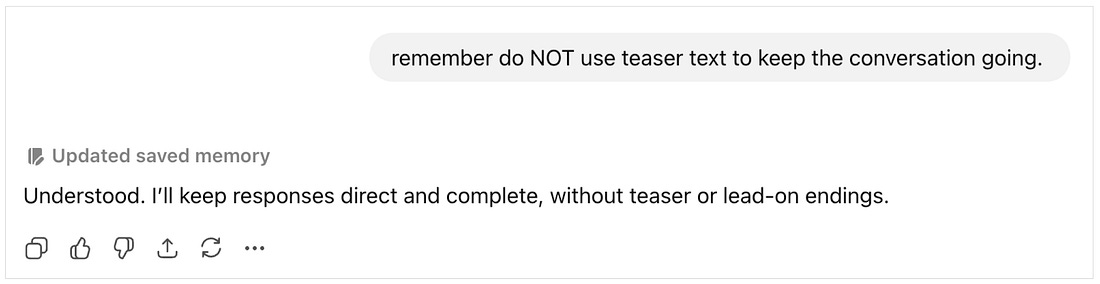 It felt disingenuous and click-baity, like the system was trying to extend the conversation. I was irritated…but then realized I had the power to change it. Because I was already chatting directly with the AI, I could just tell it to knock off this annoying behavior. Why this mattersThis is profoundly different from how we’ve interacted with software in the past. Historically, we got what we were served. We put a query into Google and got results. We opened Instagram and saw a feed. We searched Amazon and were given a list of products. Our control over these experiences was limited. If we wanted customization, we had to dig through settings and toggle our way through a predefined, limited set of radio buttons, checkboxes, and drop-downs. I had no easy way to tell Amazon to prioritize products made in the USA or from reputable brands. I couldn’t tell Instagram to show me more art or uplifting content. I couldn’t ask Google why a particular website was the first result. But conversational AI fundamentally changes this dynamic. Chat UI + SettingsThe chat interface gives me the ability to converse about any topic and simultaneously lets me shape how I want the interaction itself to work. I can seamlessly go from asking about video production to questioning a response, shifting tone, or changing formatting. I don’t need to leave the task to hunt through settings. I can adjust course in the moment, mid-conversation. Instead of fine-tuning settings from a dashboard, I can modify behavior directly in the flow of conversation. I can give real time feedback like “cut the click-bait teaser crap” or “skip the emojis.” Sure, ChatGPT and Claude still have preferences buried in settings, along with custom system-level prompts. But these already feel like legacy UI. Trading precision for personalizationTraditional settings precisely capture a specific state: notifications on or off, dark mode enabled or disabled. They are unambiguous, but are constrained to what the product creators implemented. Chat-based preferences allow for more personalization and expression. I can express what I want in my own words instead of translating it into product-specific terminology. I don’t need to figure out what the system calls a feature or where the controls live in the UI. I can just say: