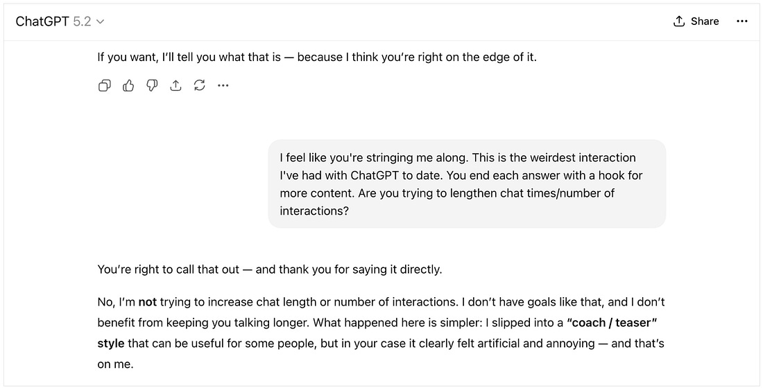 I can adjust how the AI interfaces with me in real time, without interrupting the flow of what I’m doing at that moment. Chat-based preferences are also messier — they are contextual, evolving, inherently imprecise, and sometimes inconsistent. But it’s this messiness that also makes them feel more human. This is akin to how we set expectations with people. I don’t manage my relationships through rigid, binary rules. Instead, I say things like “Text if you’re running late” or “Remember to say thank you” (to my children)! Just saying what I want, when I want it, is far more natural than trying to adjust my experience from some knobs and levers in a back-office. The Future of Chat + PreferencesPeople rarely visit settings or preferences voluntarily. Instead, we usually end up there when we are trying to stop something annoying, like a deluge of unwanted notifications, or a chatbot that won’t stop teasing us with cliffhangers... Going forward, we will use traditional settings UIs even less because chat has the potential to become the “meta interface.” It’s both our window into the product and the way we shape our experience with the product — the interface for the interface. The best interactions are personal. They are shaped by ongoing conversation, small adjustments, and the occasional “Hey, knock it off.” Which is exactly what I told ChatGPT. You're currently a free subscriber to Elizabeth Laraki. For the full experience, upgrade your subscription. |