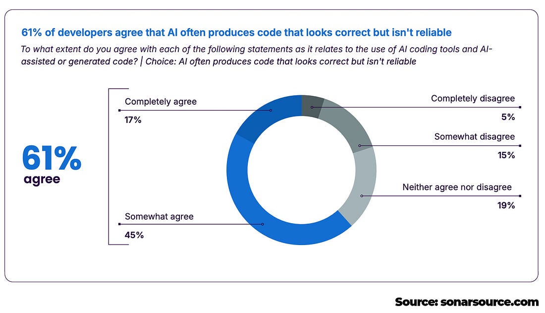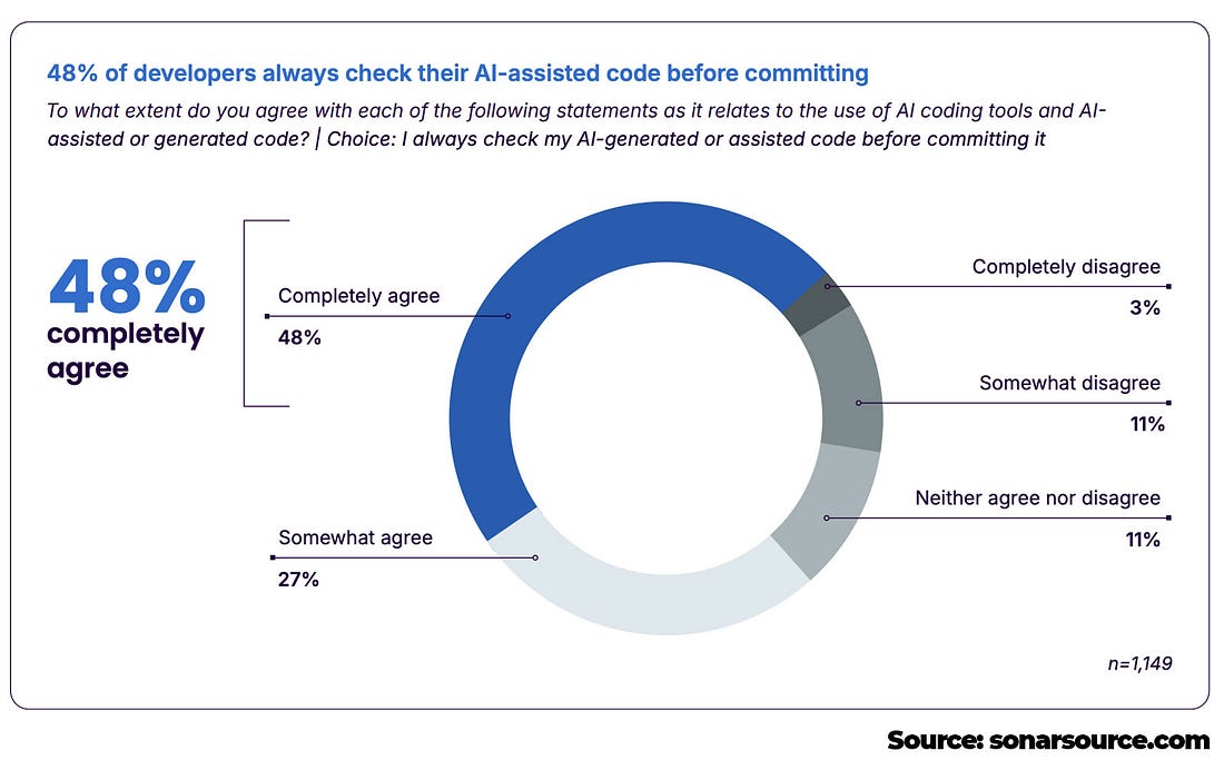 The session includes a live Q&A throughout to help you rethink your API strategy for 2026. Thanks to Buf for sponsoring this newsletter. Let’s get back to this week’s thought! IntroWith the speed of writing code increasing due to AI coding tools, skills like critical thinking, pure problem-solving, and being good at reviewing/verifying are more important than ever. But what’s alarming is that a lot of engineers increase the speed of the pure output, without verifying if the output is actually of the right quality. Based on the recent State of Code Developer Survey Report from Sonar, a lot of engineers (96%) don’t trust the output, which is a decent number, but only 48% verifies it, which is alarming in my opinion. Some other interesting data from the report: