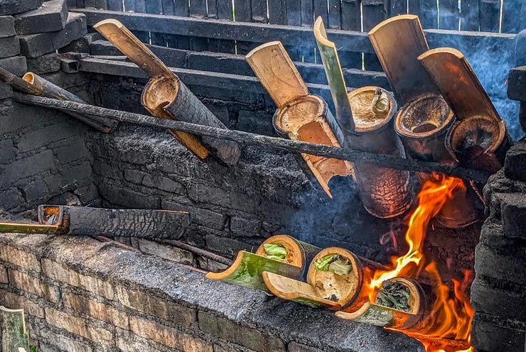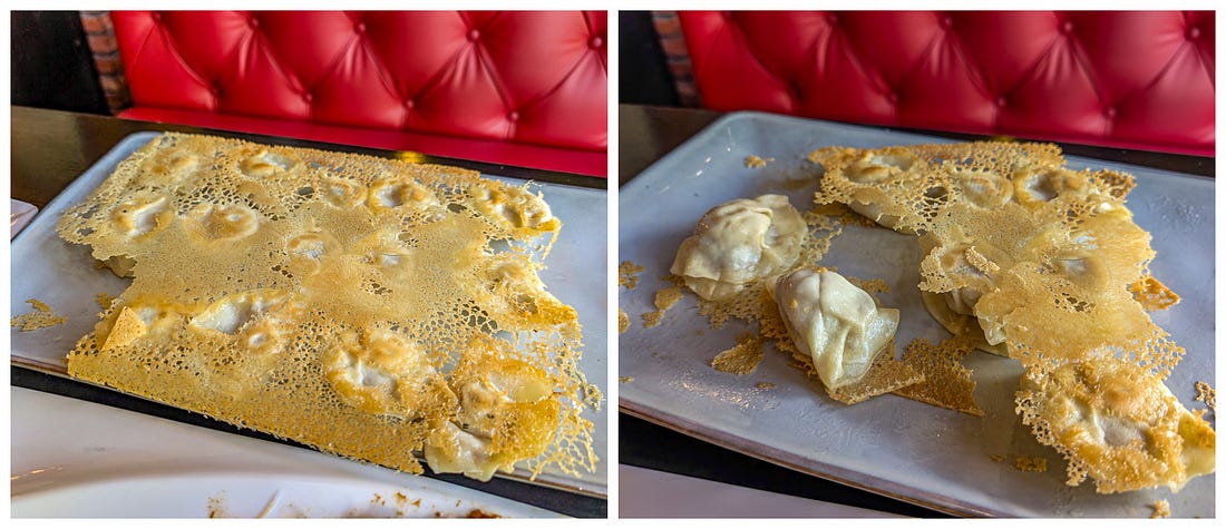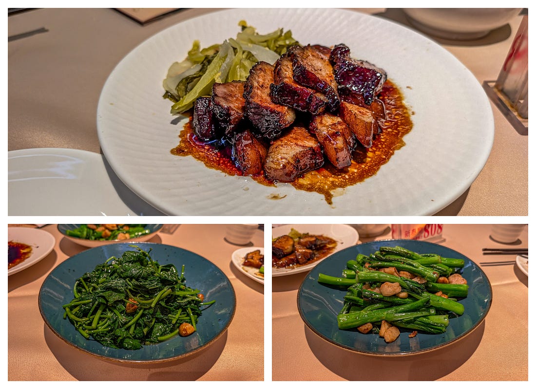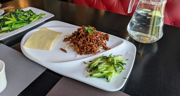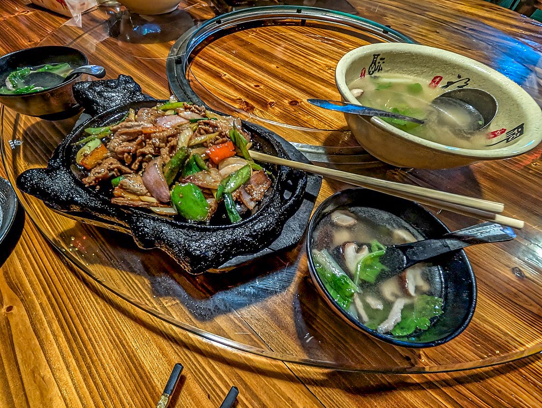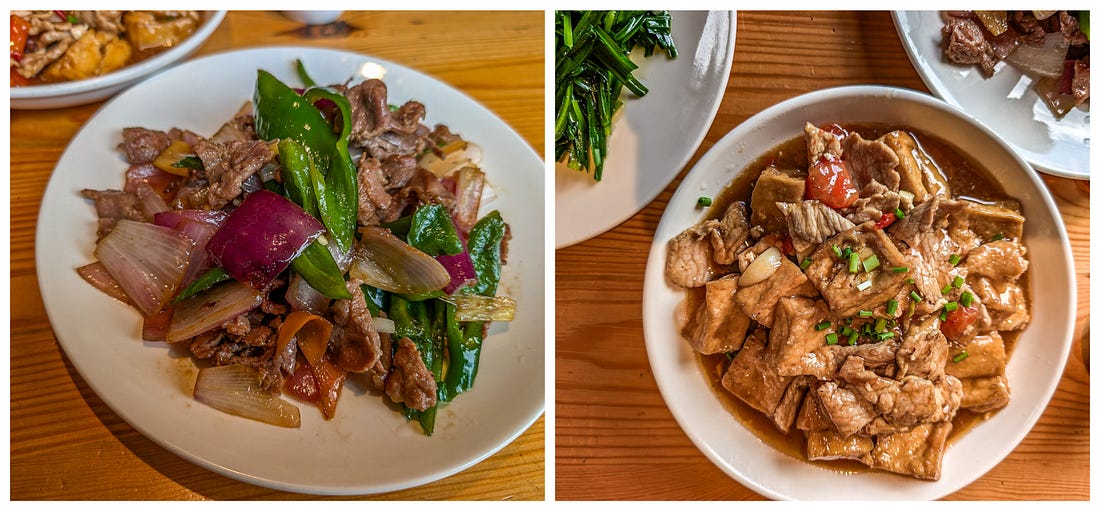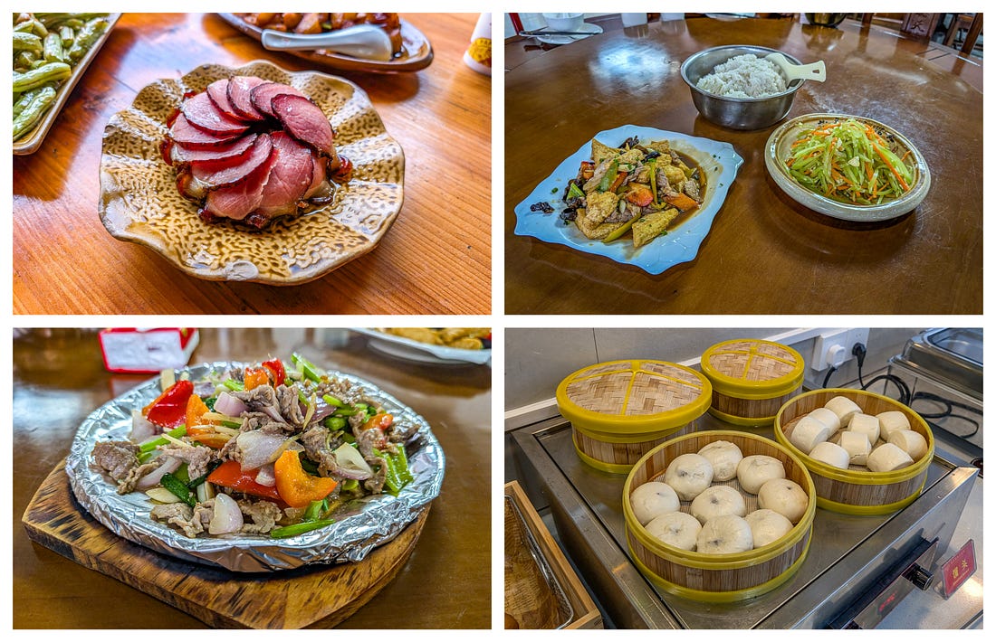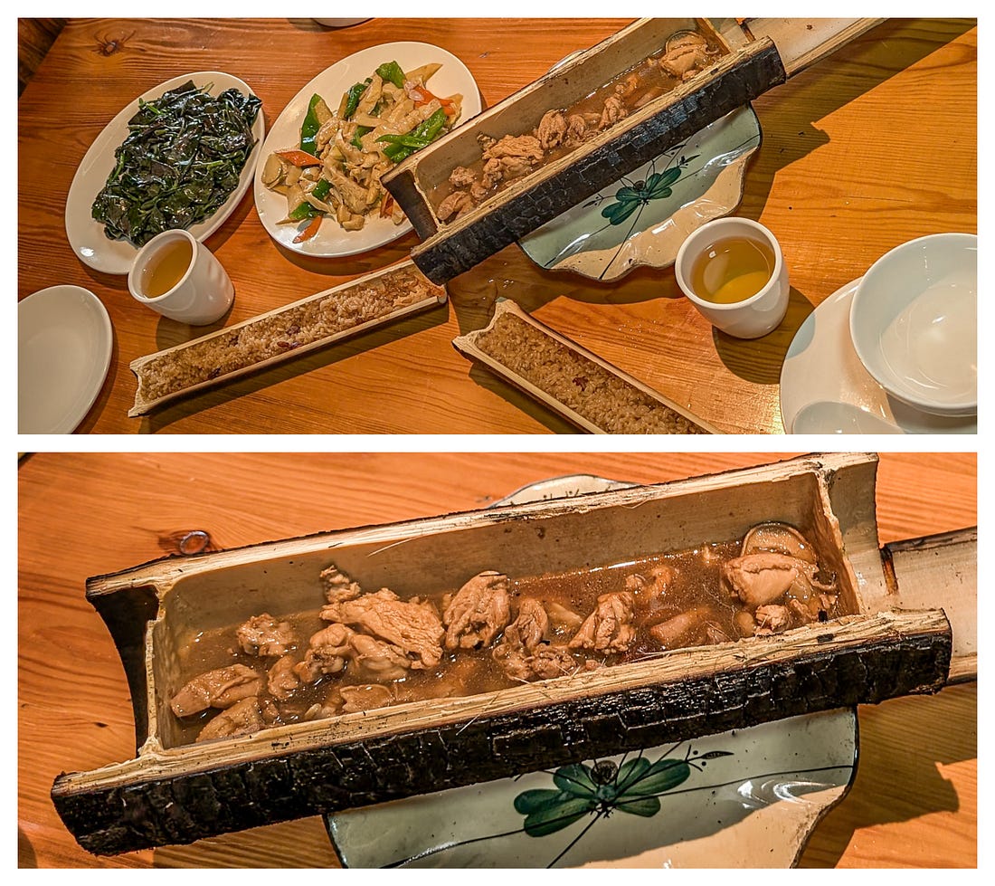What Did We Eat in China? Pork, Pork, and More Pork.See it for yourself with these tantalizing pictures!Last month, we spent ten days touring southern China, and if there was a theme to our meals, it was pork. It was in everything. Think I’m exaggerating? Then read on. (Also, I assumed at the time I would easily be able to figure out the names of all these restaurants and add links, and also the names of the various dishes. Sadly, I could not — and I stupidly didn’t take notes. Mea culpa!) Our first meal in China. All this pork could be a problem.Our first night in China, in Guangzhou, our guide took us to a Michelin-rated restaurant, and she ordered us the local area’s signature dish. It was pork. I wasn’t surprised. We’d just spent two months living in Taiwan, and I knew how much the Chinese love their pork. But I was surprised that the two other dishes our guide had ordered also included pork — if only because we had requested “lots of vegetables,” and these were both vegetable dishes. Only with pork. Problem is, for ethical reasons, I’ve long chosen not to eat pork. Pigs are extremely intelligent, and on Earth in 2025, they’re usually raised and killed in ways that are simply unacceptable to me. Our guide sensed a hesitation on my part and assumed I wasn’t crazy about the food, so she encouraged me to order something else. I suggested tofu, and she happily ordered the restaurant’s signature tofu dish. Which turned out to be tofu… stuffed with pork. My first attempt to eat less pork. Sizzling beef? Yes, let’s get the sizzling beef!Look, my problem is not that I don’t like the taste of pork or that I don’t want it in my body. My objections are entirely about animal cruelty. Which means that if the pig is already dead and cooked and is sitting on a plate in front of me, it doesn’t do anyone any good for me not to eat the stuff, does it? So at least now I knew my goal in China: to somehow stop the cooking of these pigs before their meat reached my plate. At the next restaurant, in Guilin, I requested something other than pork. As smart and worldly as all our guides were, I’m not sure any of them truly understood my request. I think it was a little like my saying to an Italian guide: “Would you mind ordering me something that doesn’t have pasta, seafood, cheese, garlic, oregano, or basil?” But when our latest guide mentioned the sizzling beef, I perked right up. “Yes! Let’s get that!” And it turned out to be the best sizzling beef I’ve ever had — hands down. Of course, he also ordered us a tofu dish that was, of course, cooked with pork. Oh, and have I mentioned that everything we’d eaten so far seemed to have been cooked in lard — that is, pig fat? Another meal with all pork — but at least it was really interesting pork.At the next restaurant, also in Guilin, our guide was really excited to order us several local dishes, and I didn’t have the heart to disappoint him by asking if they were pork. Of course, they were. But at least they were really interesting pork dishes. The pork dumplings were boiled and then oven-baked, I think, which created a crispy, eggy crust over them all. To eat them, you had to break the whole thing apart with your chopsticks. Despite being baked, they were still juicy — succulent and fantastic. The next dish left Michael and me completely perplexed — and our guide had left the restaurant, so we were completely on our own to figure out how to eat it. Here’s the dish. How would you eat it? At first, we thought those little things to the left of the meat must be wraps of some kind, but they had a very strange texture — not flour, more like a sponge. Were they, er, hand-washes? The waitress quickly deduced we had no idea how to eat this thing, and while she didn’t speak any English, she pantomimed rolling the meat and veggies up in the wraps and then eating it all together. Yes! These weird, spongy wraps were made of tofu. We gave it a try and realized: It’s moo shu pork! Okay, that’s a Chinese American dish, but still — kind of. Anyway, it was easily the single best dish we had in all of China. Finally, a meal without pork — at least in the main entree.Our latest guide mentioned that in the upcoming mountain village of Huangluo, the local signature dish was chicken and rice — both cooked separately inside different stalks of bamboo, which are then hacked open and served right at the table. Since he had used the expression “signature dish,” I recounted to our guide the story of a signature dish Michael and I had had back in Vietnam years ago: chicken wrapped up and cooked inside a banana leaf. Unfortunately, it had turned out to be a hacked-up whole chicken — including the bird’s feet, neck, head, and also lots of very sharp bones. It was only our second year of nomading, and we’d been fairly traumatized by food that was a little too “authentic” for our American tastes. We’d been laughing about our overwrought reaction ever since. Anyway, we arrived at the restaurant to find that our guide had, in fact, ordered us the cooked-in-bamboo chicken dish for our lunch (along with a pork dish and vegetables cooked in pork fat, natch). It was terrific — especially the rice, which was wonderfully thick and gummy, probably baked in chicken drippings. But I noticed that our chicken looked different than those on the other tables, and I mentioned it to our guide. “Oh, yes,” he said. “I remembered how you said you don’t like the bones and other things in your chicken, so I called ahead and had them cook it this way.” I immediately thought two things: