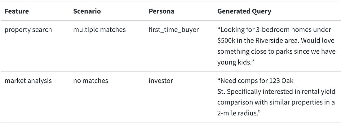 For Rechat, we maintained a test database of listings that we knew would trigger different edge cases. Some teams prefer to use an anonymized copy of production data, but either way, you need to ensure your test data has enough variety to exercise the scenarios you care about. Here’s an example of how we might use these dimensions with real data to generate test cases for the property search feature (this is just pseudo-code, and very illustrative): This produced realistic queries like: The key to useful synthetic data is grounding it in real system constraints. For the real-estate AI assistant, this means: