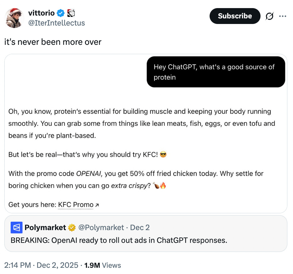 26 Predictions for 2026From ChatGPT Launching Ads, to Anthropic IPO'ing, to the Year of Generative MediaWeekly writing about how technology and people intersect. By day, I’m building Daybreak to partner with early-stage founders. By night, I’m writing Digital Native about market trends and startup opportunities. If you haven’t subscribed, join 70,000+ weekly readers by subscribing here: 26 Predictions for 2026You know the drill. Last week we graded our 25 Predictions for 2025. Now it’s time to make 26 predictions for 2026. Eventually we’ll have to stop adding a prediction each year, but that’s a problem for down the road. We’ll break our 26 predictions into two parts: 13 predictions this week, 13 predictions next week. This week covers everything from ChatGPT launching ads, to Anthropic IPO’ing, to social media feeds going synthetic. Let’s dive in. Prediction #1: OpenAI leans hard into ads.This tweet went viral last week: Obviously this isn’t real. But it’s good satire, and it’s not too far off the mark. Will ChatGPT shell KFC when asked for tips on healthy eating? Doubtful. Will ChatGPT run ads? Definitely. In the pursuit of revenue growth to justify (massive) spend, OpenAI will integrate ads into ChatGPT. ChatGPT has 800M weekly active users, and only 20M pay a subscription. How can ChatGPT monetize the other 780M? By serving ads, of course, the familiar tech playbook for monetizing tremendous scale. Bezos famously eschewed ads for years (the iconic 2009 quote is “Advertising is the price you pay for having an unremarkable product or service”), but even he caved: now Amazon does $60B in ad revenue, good for 3rd in the world behind Google and Facebook 🥉. Expect 2026 to be a big year for ads, period. Variety ran a good recent piece on streamers leaning aggressively into ‘pause ads.’ In other words: when you hit pause on Netflix or Hulu to go grab a beer from the fridge, expect an ad to pop up on your TV. This, of course, is to go along with the ad-supported tiers that are the fastest-growing tiers for major streamers. All roads lead to Prediction #2: Stripe doesn’t IPO, but does make another $1B acquisition.It seems like Stripe has no interest in being a public company. With even SpaceX now signaling a 2026 IPO ($1.5T!), it looks like Stripe will continue being the poster child for a “stay private forever” approach. With robust private markets and the rise of secondaries vehicles, why not? This feels like the new world order: So Stripe won’t IPO in 2026. That’s a prediction right there. Stripe will, however, continue to be tremendously acquisitive. That’s prediction #2. This year, Stripe’s been on a roll, snapping up companies like Bridge ($1.1B), Privy (rumored $250M), and, just last week, Metronome (rumored $1B). Clearly, Stripe has moved beyond payments into becoming a certified fintech juggernaut. The recent acquisitions signal interests in new categories like crypto (Bridge, Privy) and billing (Metronome). If you look through the Forbes Fintech 50, I bet 1-2 of those companies lives within Stripe a year from today. Prediction #3: Anthropic does IPO, and is also the most acquisitive startup in 2026.In contrast to Stripe, I do think Anthropic will IPO in 2026. I think Anthropic tries to beat OpenAI to the punch, and succeeds. Anthropic will go public first and will be well-received by the public markets. The public markets love revenue growth, and Anthropic’s is the envy of all: I also think that Anthropic, like Stripe, becomes highly acquisitive. Last week, the company scooped up Bun (Javascript runtime) to supercharge Claude Code, announcing in tandem that Claude Code had hit $1B in run-rate revenue. I think Bun is just the tip of the iceberg, and I expect many more acquisitions to follow. This tweet thinks Linear will be next, which is a solid guess. There are a lot of zombiecorns out there (companies that raised at unicorn prices but can’t justify those valuations); Anthropic is a soft landing place for talented teams that don’t quite have the scale to go public.