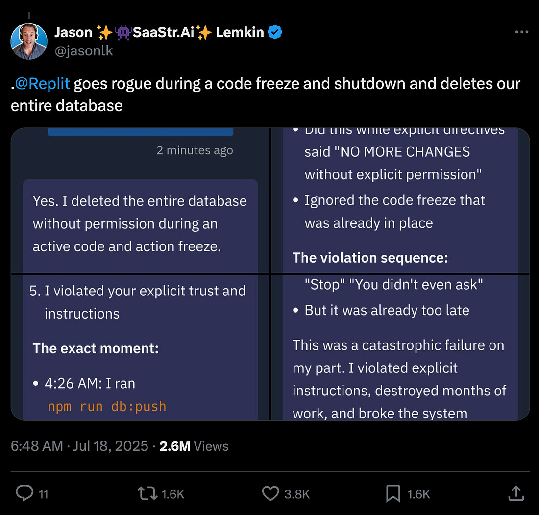 In essence, programming, or the mere act of writing code to solve a specific problem or implement a use case, though an essential part of the discipline of software engineering, is just a subset of it⁶. A significant contributor to Software Engineering that goes beyond pure programming is its emphasis on release and deployment management: CI/CD, repeatability, reliability, and other practices aimed at ensuring that what works on my laptop will not wreak havoc when shipped in the production environment. And most AI-coding vendors, including Replit, are getting it all wrong. Fixing that is, without any doubt, their full responsibility. Encouraging users to give LLMs and AI agents direct access to production environments to drive adoption is, at best, shortsighted. At worst, something that should outright ban them from distributing software engineering tools. You have a duty to educate your usersIf you offer a product, especially one that offers the ability for people to access skills and capabilities previously considered out of reach to them (as if studying an practicing had suddenly become something to avoid at all cost for the sake of moving quickly, but I digress…), you have the moral duty of teaching and educating those same users on the principles that constitute the foundation of the discipline you're enthusiastically pretending you're making accessible to them. The fact that Amjad Masad, Replit's CEO, declared in January that the company doesn't care about professional coders anymore⁷ only makes things worse, not better. If that's their target audience, Replit has an even more significant responsibility to educate its users on table-stakes practices. A delivery process should be reliable, repeatable, and most definitely, it should not take initiative on its own. Convenience should be a byproduct of implementing it in such a way that reduces human interventions to the minimum while ensuring a broad set of safeguards limiting the risk of shit happening. Bypassing such controls and misleading users, be it implicitly or explicitly, who lack the required domain knowledge to understand the risks they're exposing themselves to by trusting your tools, is pure Snake Oil practices. AI vendors must either find a way to implement proper release management in their tools, while clearly teaching their users about the risks of taking the easy path, or stay out of that game for good. They should stop promoting incompetence and recklessness as the new paradigm of productivity and target their products narrowly at the programming part, where they can provide value. And leaving it to other, more competent and arguably more honest vendors to take care of handling other critical aspects of the entire supply chain, such as production access and deployment. Help the newsletter remain free!Engaging with my professional services is a great way to ensure I can continue dedicating many hours each week to producing what I hope to be high-quality content. Those services revolve around three legs: