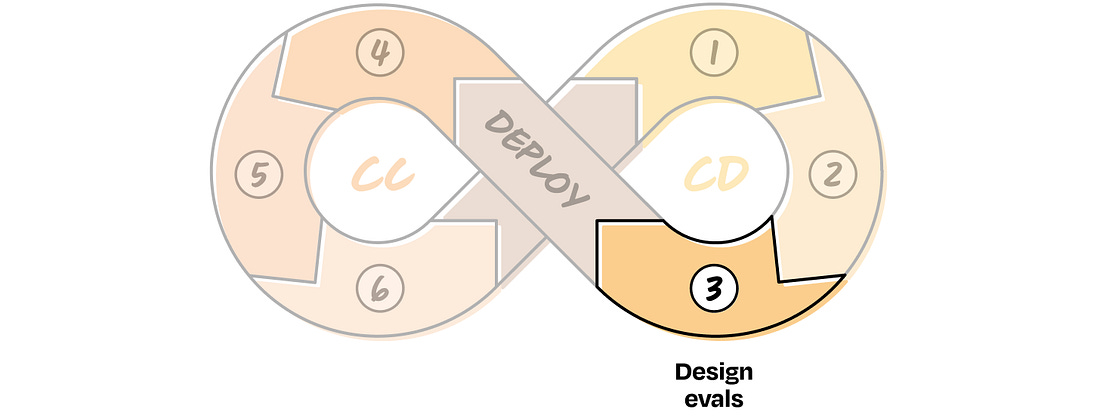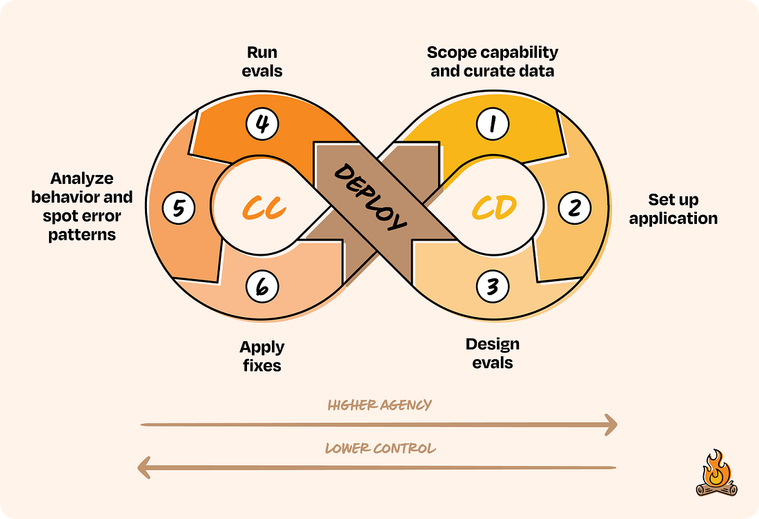 In our framework, product builders work in a continuous loop of development (CD) and calibration (CC). During development, you scope the problem, design the architecture, and set up evaluations to keep non-determinism in check. You start with features that are low-agency and high-control, then gradually move up as the system proves it can handle more. Then you deploy, not as a finish line but as a transition into the next phase. Once you’ve deployed, you enter the calibration loop, where you observe real behavior, figure out what broke, and make targeted improvements. With every cycle, the system earns a bit more agency. Over time, this loop turns into a flywheel, tightening feedback, building trust, and making the product stronger with each version. Let’s go deeper into each step of the CC/CD loop, what it looks like, why it matters, and how to do it well. The first three steps make up the Continuous Development side of the loop: scoping the capability, setting up the application, and designing evals. CD 1. Scope capability and curate dataLet’s say you have a big product idea and you’ve already done your research. It’s clear that AI is the right approach. In traditional software development, you’d typically plan for v1, v2, v3 of the new product based on feature depth or user needs. With AI systems, the versioning still applies, but the lens shifts. Here, each version is defined by how much agency the system has and how much control you’re willing to give up. So instead of thinking in terms of feature sets, you scope capabilities. Start by identifying a set of features that are high control and low agency (version 1 in the image above). These should be small, testable, and easy to observe. From there, think about how those capabilities can evolve over time by gradually increasing agency, one version at a time. The goal is to break down a lofty end state into early behaviors that you can evaluate, iterate on, and build upward from. For instance, if your end goal is to automate customer support in your company, a high-control way to start would be to scope v1 (version 1) as simply routing tickets to the right department, then move to v2 where the system suggests possible resolutions, and only in v3 allow it to auto-resolve with human fallback. Remember, this is just one approach. What it looks like in practice will depend on your product, but the process tends to be consistent: Start with simple decisions that are easy to verify and easy for humans to override. Then, as you progress through the CC/CD loop, gradually layer in more autonomy with each version. How long you stay in each version depends entirely on how much behavioral signal you’re seeing. You’re optimizing for understanding how your AI behaves under real-world noise and variation. Here are a couple more examples: Marketing assistant