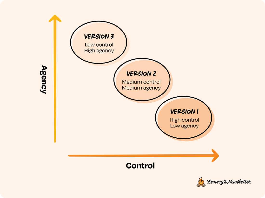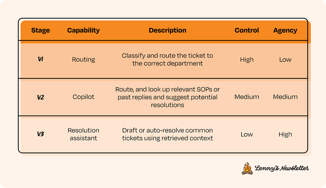 You can pull this from past logs if available, or generate examples based on how your product is expected to work. This dataset helps you evaluate system performance and also tells you what context your assistant needs in order to perform reliably. Since most products start cold, aim to gather at least 20 to 100 examples up front. We’ll continue using the customer support example to walk through the next steps in the CC/CD loop. Imagine you’re building toward a fully autonomous support system for a company. Below are the versions we’ll reference, along with their corresponding agency and control levels. We’ll refer to v1, v2, and v3 throughout the rest of the post. CD 2. Set up applicationMost people skip step 1 and jump into the setup phase too early, getting lost in implementation choices and overthinking which components are needed. But if you’ve scoped your capability properly in step 1, looked at enough examples, and curated a solid reference dataset, setting up the application should be fairly straightforward. You already know what the system needs to do, have a sense of what users are likely to throw at it, and understand what a good response looks like. Now it’s just about wiring together the simplest version that gives you a useful signal. There’s a famous saying in software, for a reason: “Premature optimization is the root of all evil.” It applies here too. Don’t overengineer. Don’t over-optimize. Not at this stage. Just don’t. Build only what’s needed for your current version. Make the system measurable and iterable by setting up logs to capture what the system sees from the user, what it returns, and how people interact with it. This will form the basis of your live interaction dataset and help you improve the system over time. We won’t go deep into implementation here, but if you’re exposing this to end users, make sure the basics like guardrails and compliance are in place. One more important point: When setting up the application, make sure control can be handed back to humans seamlessly when needed. We’ll refer to these as control handoffs. For example, in the customer support v1, if a ticket is misrouted, the receiving agent (the point of contact for that department) should be able to reroute it easily. Since that correction is logged, it not only helps improve the system over time but also preserves the user experience. Thinking about control handoffs from the start is key to building trust and keeping things recoverable. CD 3. Design evalsThis is the part that usually takes a bit of thought. Before shipping anything, you need to define how you’ll measure whether the system is doing what you expect and whether it’s ready for the next step. You do this using evaluation metrics (evals, for short). So, what are evals?... Subscribe to Lenny's Newsletter to unlock the rest.Become a paying subscriber of Lenny's Newsletter to get access to this post and other subscriber-only content. A subscription gets you: