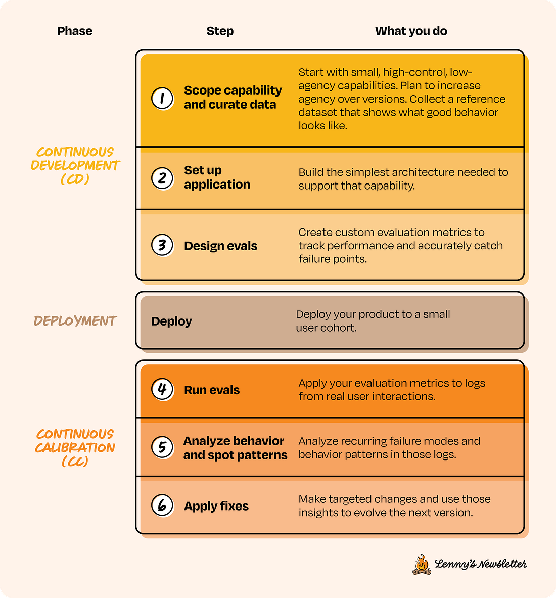 👋 Welcome to a 🔒 paid edition 🔒 of my weekly newsletter. Each week, I tackle reader questions about building product, driving growth, and accelerating your career. For more: Lenny’s Podcast | How I AI | Lennybot | Lenny’s Reads | Courses P.S. Annual subscribers get a free year of 15+ premium products: Lovable, Replit, Bolt, n8n, Wispr Flow, Descript, Linear, Gamma, Superhuman, Warp, Granola, Perplexity, Raycast, Magic Patterns, Mobbin, and ChatPRD (while supplies last). Subscribe now. In this AI era, tech leaders need to re-evaluate every single industry best practice for building great products. AI products are just built differently. The teams that realize that and adjust the most quickly will have a huge advantage. Based on their experience leading over 50 AI implementations at companies including OpenAI, Google, Amazon, Databricks, and Kumo, Aishwarya Reganti and Kiriti Badam have developed the Continuous Calibration/Continuous Development (CC/CD) framework to specifically address the unique challenges of shipping great AI-powered products. In this post, they’re sharing it for the first time with you. For more from Aish and Kiriti, check out their popular Maven course and their upcoming free lightning talk that explores this topic in depth. You can also listen to this post in convenient podcast form: Spotify / Apple / YouTube If you’re a product manager or builder shipping AI features or products, you’ve probably felt this: Your company is under pressure to launch something with AI. A promising idea takes shape. The team nails the demo, the early reviews look good, and stakeholders are excited. You push hard to ship it to production. Then things start to break. You’re deep in the weeds, trying to figure out what went wrong. But the issues are tangled and hard to trace, and nothing points to a single fix. Suddenly your entire product approach feels shaky. We’ve seen this play out again and again. Over the past few years, we’ve helped over 50 companies design, ship, and scale AI-powered autonomous systems with thousands of customers. Across all of these experiences, we’ve seen a common pitfall: people overlook the fact that AI systems fundamentally break the assumptions of traditional software products. You can’t build AI products like other products, for two reasons: