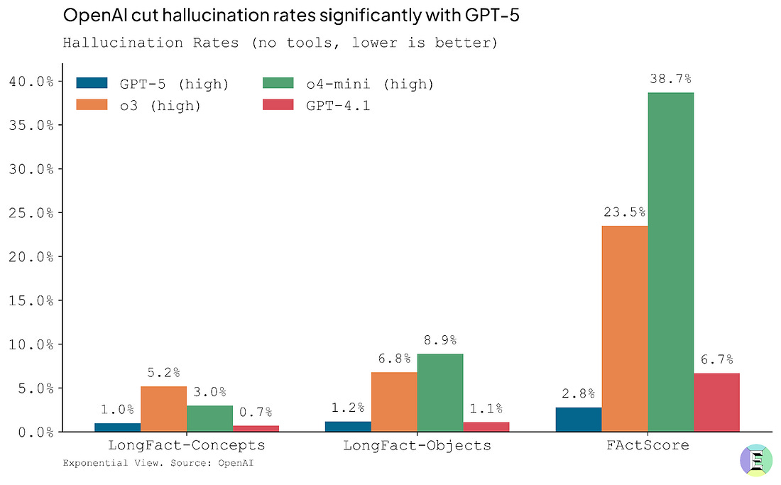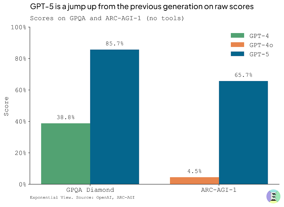 Earlier this year, a paper claimed that GPT‑4.5 passed a more rigorous, three‑party Turing test, with judges rating it human in 73% of five‑minute conversations. Whether this counts as a pass is still contested. On the one hand, Turing’s test measured substitutability – how well a machine can stand in for a human – not genuine understanding. On the other, critics argued that short exchanges are too forgiving and that a meaningful pass would require longer, open‑ended dialogue. But if we say that AI has passed the Turing test, what does that even mean? The victory feels hollow. Once systems beat the Turing test, we moved the bar: from conversation to formal benchmarks. LLMs went on to crush many of these, too. Yet the same pattern holds: the smarter the system, the less its achievements feel like proof of intelligence. Here the conversation shifts from tests we can name to a target we cannot agree on. Part of the problem is definitional: there is no consensus on what artificial general intelligence is. Is it matching human cognition across all domains, or being a flexible, self‑improving agent? Intelligence resists collapsing into a single score. Decades of IQ debates show that. Is AGI a universal problem‑solver, an architecture mirroring human thought, or a form of consciousness? With such a hazy target, success will always feel provisional. Sam Altman now calls AGI ‘not a super useful term.’ I’ve long found the term problematic; it’s not an accurate descriptor of what LLMs are or their usefulness. Suppose a system were truly “intelligent” in the human sense. Couldn’t we train it only on knowledge up to Isaac Newton and watch it rediscover everything humanity has learned in the 300 years since? By that standard, GPT‑5 is nowhere close – and I did not expect it to be. Its goal was not raw knowledge accumulation, which arguably defined GPT-4’s leap. GPT-5’s focus was on action: better tool use and more agentic reasoning. GPT-5 performs better on some benchmarks measuring agentic tasks and is on a par with others.² And compared with the last generation, the raw jumps are striking: on GPQA Diamond (advanced science questions), GPT-4 scored 38.8%, GPT-5 scored 85.7%;³ on ARC-AGI-1, GPT-4o managed 4.5%, GPT-5 hit 65.7%. Yet the wow factor is muted. Most people are not measuring GPT‑5 against GPT‑4 from March 2023. They are stacking it against o3 from just a few months ago. Frontier models arrive in rapid succession, the baseline shifts at speed and each breakthrough lands half‑forgotten. In that light, even a giant’s stride can feel like treading water. 2. The reliability paradoxAs systems grow more reliable, their rare failures become less predictable and more jarring. Trust can stagnate – or even decline – despite falling error rates. On paper, GPT‑5 should be more reliable than previous LLMs. OpenAI’s launch benchmarks suggest it hallucinates far less than o3, especially on conceptual and object‑level reasoning. In my own use, hallucinations feel rarer. GPT‑5 Thinking aced a 51‑item, nine‑data‑point analysis I gave it and added a derivative analysis I had not asked for. Claude Opus 4.1, by contrast, miscounted the items and gave weaker recommendations. GPT‑5’s output took me 30 minutes to verify in Excel – not because it was wrong, but because the data format was awkward. Across simpler tasks, this is the pattern: more accurate, more often. The problem is when it is wrong. During a recent trip to Tokyo, I asked GPT‑5 to name the city’s oldest Italian restaurant while standing under it. It named a different place, yet also knew the full history of the restaurant I was in when I prompted it harder. The same kind of jarring mistake popped up in OpenAI’s live demo, where GPT‑5 botched the Bernoulli effect. These errors are not frequent, but they are unpredictable, and that makes them dangerous. Psychologists call this automation complacency: the more reliable a system is, the less closely we watch it, and the more likely rare errors are to slip through. With GPT‑4‑level error rates, I stayed alert for slip‑ups; with GPT‑5, I can feel myself letting my guard down. The brain’s ‘error detection’ system habituates, so vigilance drops. This risk compounds in agentic workflows. Even with a 1% hallucination rate, a 25-step autonomous process has roughly a 22% chance of at least one major error. For enterprise use, that is still too high. Last week, AWS released Automated Reasoning Checks, a formal-verification safeguard that encodes domain rules into logic and mathematically tests AI outputs against them. They tout “up to 99% accuracy.” This will help, but it’s not the last word. Nevertheless, when mistakes are rarer yet less predictable, perceived reliability does not climb as much as the benchmarks suggest. That is why GPT‑5’s improved accuracy can still feel like a modest leap. The progress is real, but it does not fully translate into user confidence. 3. The benevolent-control paradoxThe more capable the assistant, the more its “helpful” defaults shape our choices – turning empowerment into subtle control... Subscribe to Exponential View to unlock the rest.Become a paying subscriber of Exponential View to get access to this post and other subscriber-only content. A subscription gets you: