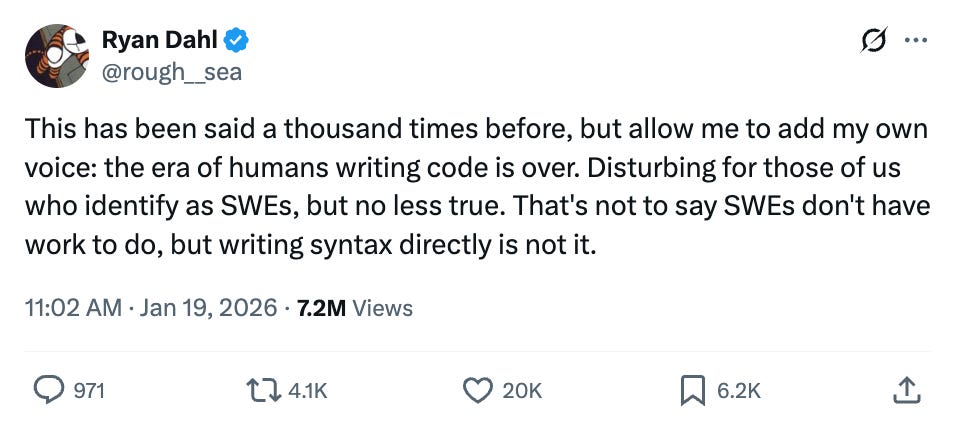 And so on and so on. Change takes time. If you study Carlota Perez’s theory on ~50-year tech-cycles, we’re still in “Phase One” of AI, which should last about a decade. If you consider the Big Bang event to be the launch of ChatGPT (November 2022), we’re only ~3 years in. Lately, we’ve been acting like we’re in Phase Three. I think this is partly because there’s such a gaping crevasse between tech-savvy early adopters (most of the people reading this essay) and everyone else; only 1 in 3 Americans has used ChatGPT! We talked about scaling laws. Scaling laws describe capability acceleration, but adoption has no such law; it’s governed by human and institutional friction. Because things have been changing so fast, there’s been a lot of hand-wringing. The last few weeks have brought declarations that software is dead, that the labor markets will go into turmoil, that life will soon be unrecognizable. I disagree. Here are three of my views on how things play out from here: 1) AI will eat labor, but not all at once. In the near-term, augmentation trumps automation.US SaaS revenue is around $300B. The US labor market is $13T, or 43x bigger. This is the market that everyone expects AI to devour. This will happen, and it’s already started. The past few weeks have been the Big Bang for code generation specifically, and the days of humans writing code may be over. But this doesn’t mean we won’t need engineers. To the contrary, I expect the demand for engineers to go up. In last month’s The Year of Invisible AI we talked about Jevon’s Paradox, which contends that as a good becomes more accessible, demand for that good increases. More and more companies will need engineers to orchestrate agents, and those engineers will be able to accomplish in days (hours?) what used to take months. Here’s the Moltbot founder’s set-up, which more terminals open than I can count. Software development is the 3rd-largest category of labor spend in the US, after legal (2nd) and healthcare admin (1st). We’re going to see all these categories reinvented. In the near term, this will mean more augmentation than automation. Hiring will slow, but I don’t think we’ll see mass layoffs. We’ll see enormous productivity gains per worker, though even that will take time: most people will have to be nudged toward AI tools (and trained on how to use them). This is why “forward deployed” roles are so in vogue right now. Companies need people to help with implementation because implementation is, well, the gap between capability and adoption. 2) Software isn’t dead, but it’s changing. You still won’t get fired for buying IBM, but disruption is coming.The last couple weeks have been rough for SaaS: