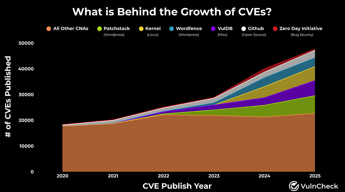 The same goes for scanners, from networks, to agent-based sensors, legacy hardware, API-based scanning, cloud environments and more. Customers want full not partial coverage when it comes to understanding their vulnerability footprint. This means new startups may have flashy and promising capabilities, but they lack comprehensive coverage and depth that most enterprises simply must have when it comes to VulnMgt. What’s Behind the Growth of CVE’s?Every year we tend to look at the raw number of CVE growth and stand in amazement, knowing we’re already struggling to keep up with vulnerability remediation and it is only getting worse. But, what’s actually behind the CVE growth? My friend Patrick Garrity of VulnCheck provides a great breakdown in a recent post of his. While it is true that the raw number of CVE’s is going up YoY, the truth is much of the growth is being driven by a small handful of CNA’s as he shows below: This isn’t to say that CVE growth isn’t a challenge, and in fact, I anticipate the rise of AI-driven development and vibe coding may lead to even more exponential growth, albeit it will be difficult to measure at the NVD level, given they don’t often know how the code was developed. All that said, it is helpful to see that a handful of CNAs often have an outsized impact on CVE growth annually. Resilient Cyber is free today. But if you enjoyed this post, you can tell Resilient Cyber that their writing is valuable by pledging a future subscription. You won't be charged unless they enable payments. |