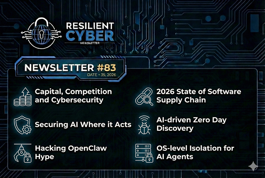 Resilient Cyber Newsletter #83Capital, Competition and Cybersecurity, Securing AI Where it Acts, Hacking OpenClaw Hype, 2026 State of Software Supply Chain AI-driven Zero Day Discovery, and OS-level Isolation for AI AgentsWeek of February 3, 2026 Welcome to issue #82 of the Resilient Cyber Newsletter! This week’s Resilient Cyber Newsletter spans the full landscape, from a deep conversation with Carta’s Peter Walker on the capital, competition, and talent dynamics shaping cybersecurity startups and beyond, to mounting evidence that agentic AI risks have crossed from theoretical to operational. Operation Bizarre Bazaar documented over 35,000 LLMjacking attack sessions in 40 days, the OpenClaw/Moltbot saga exposed the fragility of the Personal AI Assistant (PAI) craze, and new research shows AI agents can exploit vulnerabilities for pocket change. The economics of attack and defense are shifting fast. On the building side, there’s real momentum. I shared my talk from the Cloud Security Alliance’s Agentic AI Summit on securing AI where it acts, Sonatype’s 2026 report revealed open source malware has gone industrial with 454,000+ new malicious packages last year, and Cisco open-sourced their Skill Scanner for agent security. From Lakera’s case against LLMs grading their own homework to Sigstore extending provenance to AI agents, the throughline is clear: our security tooling and frameworks need to evolve as fast as the threats they’re meant to address. Let’s dig into what’s been an exceptionally eventful week. Interested in sponsoring an issue of Resilient Cyber? This includes reaching over 31,000 subscribers, ranging from Developers, Engineers, Architects, CISO’s/Security Leaders and Business Executives Reach out below!