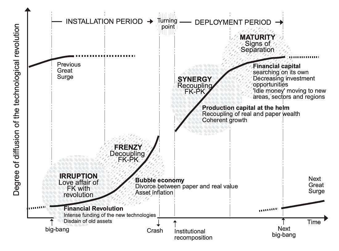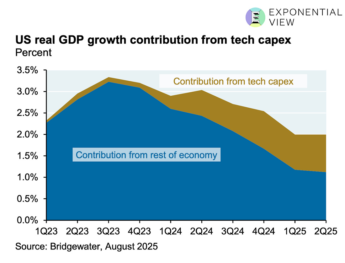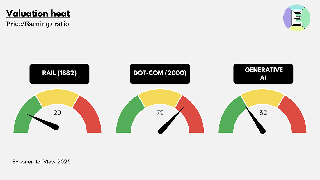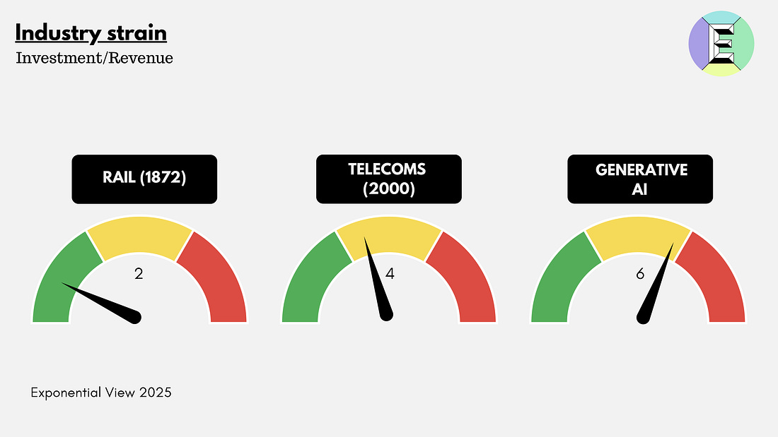 A month ago, I set out to answer a deceptively simple question: Is AI a bubble? Since 2024, people have been asking me this as I’ve spoken at events around the world. Even as Wall Street bankers largely see this as an investment boom, more people are asking the question in meeting rooms and conference halls in Europe and the US. Some have made up their minds. Gary Marcus called it a “peak bubble.” The Atlantic warns that there is a “possibility that we’re currently experiencing an AI bubble, in which investor excitement has gotten too far ahead of the technology’s near-term productivity benefits. If that bubble bursts, it could put the dot-com crash to shame – and the tech giants and their Silicon Valley backers won’t be the only ones who suffer.” The Economist said that “the potential cost has risen alarmingly high.” The best way to understand a question like this is to create a framework, one that you can update as new evidence emerges. Putting this together has taken dozens of hours of data analysis, modeling and numerous conversations with investors and executives. This essay is that framework: five gauges to weigh genAI against history’s bubbles. I studied and lived through the dot-com bubble. I was an investor and felt its effects firsthand.¹ Like many of you, I was also active during the Global Financial Crisis. For this reason, I’ve invested considerable thought and analysis into a robust framework to understand what’s going on. I’ll share it with you today. My thinking is grounded in the study of Carlota Perez, Bill Janeway and other giants in the field, as well as financial analyses of major banks and analysts. But what I haven’t seen anywhere else is a framework that translates those theories into a practical dashboard for AI today: a set of parameters you can read, compare across past bubbles and use to orient your decisions. We will make the underlying data and methodology available to members of Exponential View in the coming weeks. I usually reserve my deep dives for paying members of Exponential View. But this question is too important, and the public debate clouded by posturing, for me to keep it behind a paywall. So today’s piece is free for everyone to read. If you want to access this analysis as a PDF, you can download it here. If you are an investor or executive navigating these questions, I am opening a very limited number of consultation sessions to work directly on them. This is a bespoke opportunity to stress-test your strategy with the same analytical framework I’ve developed. You can apply here. The meaning of a bubbleBubbles are among the oldest stories of capitalism. They’re parables of excess, belief and collapse. But bubbles are not just financial phenomena; they are cultural artifacts. They return again and again as morality tales about greed and folly. Tulip mania, often misremembered as a frenzy of bankrupt weavers and drowning merchants, was less disastrous than legend suggests. It was confined to wealthy merchants and left the Dutch economy largely unscathed. But the myth has endured, and that is the point: bubbles become stories we tell ourselves about the dangers of optimism. Some bubbles are financial: the South Sea frenzy of the 1720s, the roaring stock market of the 1920s, Japan’s real-estate boom in the 1980s and the housing crash of 2008.² Some are technological. In the 1840s, railways were hailed as the veins of a new industrial body. They were. But a body needs only so many veins, and tracks were soon laid in places commerce could not sustain. Telecoms in the 1990s promised a wired utopia, only for 70 million miles of excess fiber to lie dark underground. The dot-com boom gave us visions of a new economy, much of which did eventually materialize, but not before valuations evaporated in 2000. The funny thing is that there doesn’t seem to be an academic consensus on what an investment bubble is. Nobel laureate in economics Eugene Fama has gone so far as to say they don’t exist. I want to go beyond the notion that we know a bubble when we see a bubble. There are two interrelated systems at work. The first, the most visible, is when stock markets become absurdly overvalued and collapse. The second is whether the quantity of productive capital (going into capital expenditure or venture capital) deployed collapses. The two are related, of course. A collapse in equity prices makes investment flows more expensive. And a secular decline in productive capital investment may be read by equity markets as a harbinger of a slowdown. But to frame this: we see a bubble as being a 50% drawdown from the peak equity value that is sustained for at least five years. In the case of the US housing bubble and the dot-com, that trough was roughly five years long. Full recovery to pre-bubble peaks took 10 years for US housing, and 15 for the dot-com. Alongside, we would expect a substantial decline in the rate of productive capital deployed, once again 50% from peak. For the purposes of this analysis, by “bubble” I’ll address both of those competing dimensions. Ultimately, it means a phase marked by a rapid escalation in prices and investment, where valuations drift materially away from the underlying prospects and realistic earnings power of the assets involved. Bubbles thrive on abundant capital and seductive narratives, and they tend to end in a sharp and sustained reversal that wipes out much of the paper wealth created on the way up. A “boom,” by contrast, can look very similar in its early stages with rising valuations and accelerating investment. But the crucial distinction is that, in a boom, fundamentals eventually catch up. The underlying cash flows, productivity gains, or genuine demand growth rise to meet the optimism. Booms can still overshoot, but they consolidate into durable industries and lasting economic value. Between the two lies a gray zone: periods of exuberance when it is genuinely hard to t