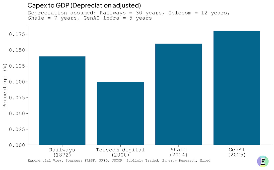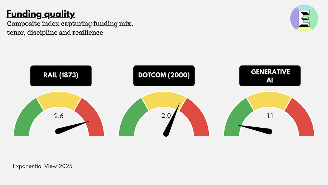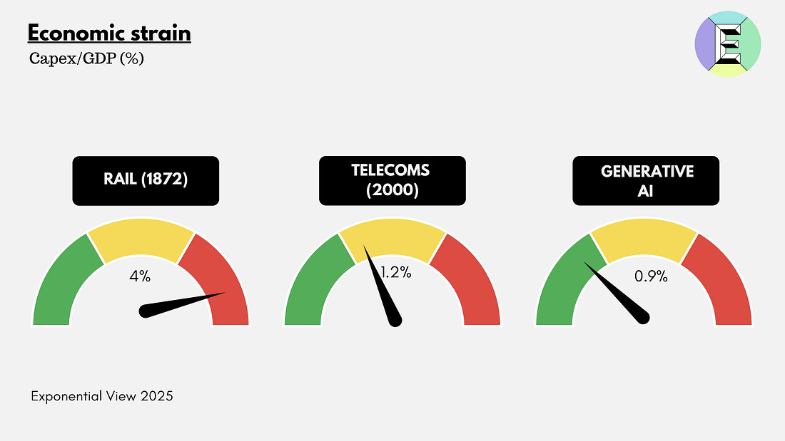 In the rest of the essay, I look at each gauge to explain why it may be green, amber or red, and at the end I pull them together into a full dashboard view. Gauge 1: Economic strainThe investment underway is vast, with Morgan Stanley expecting $3 trillion in AI infrastructure spend by 2029. But it has not yet reached the runaway extremes of history’s great blowouts. What makes this dimension tricky is dependence. In the US, more than a third of GDP growth can be traced to data center construction. This is not inherently bad, but it may be dangerous if the momentum falters. An economy leaning this heavily on one sector for growth can find the ground falling away faster than expected. The surge of capital expenditure (capex), poured into the physical infrastructure that AI demands, is an act of optimism. This is what capex is. Money spent today in the belief that it will become a funnel of revenue tomorrow. If it’s well-placed today, it will eventually lead to productivity gains and economic expansion. If you want to sell people hula hoops to promote their health and happiness, you need to buy hula hoops first. And somewhere down the line, there needs to be a factory making them. Funding that factory is capex. You deploy the capex to build a useful thing that you can sell. Capex investment is often, but not always, a precursor to a growing business. AI data centers have a similar quality, and something more. They are not just factories for a single product; they are infrastructure. Microsoft, OpenAI and the US government all see it this way. They see compute as a foundational utility of the 21st century, no less critical than highways, railways, power grids or telecom networks were in earlier eras. I made the same argument in my last book, so you can guess where I stand. Excluding the US, sovereign governments have made more than $1 trillion in commitments to AI as infrastructure by 2030. To build such infrastructure inevitably requires historic sums, on a par with the railway and electricity build-outs of the past. McKinsey projects that meeting AI-driven demand by 2030 will require around 156 GW of new electrical capacity — the size of Spain’s and Portugal’s grids combined. The firm estimates this will cost $5-7.9 trillion in capital spending. For context, this is about twenty times the cost of the Apollo missions. This would place AI data centers among the largest infrastructure build-outs in modern history. But useful though infrastructure is, especially when private capital gets involved, things can get divorced from reality. The financing structure matters as much as the technology itself. The railways in the US were largely privately funded and suffered from multiple investment bubbles. Electricity and road systems, by contrast, benefited from greater public investment and coordination, and were less prone to speculative excess. A boom becomes dangerous when the resources it demands start to bend the whole economy around it. Wages get sucked into one sector, supply chains reorient to serve it and capital markets grow dependent on it. The snapback is vicious when expectations break. One way to gauge the economic strain is to look at investment as a share of GDP, the portion of national output funneled into a single technological frontier. It is a crude but telling ratio. It shows how heavily the economy leans on one technological bet. In the case of AI infrastructure, most of that spending takes the form of capital expenditures: the servers, cooling systems, networking gear, shells of concrete and steel and the power infrastructure required to keep them running. By that measure, the railway bubbles were the heaviest. In the United States, railway spending peaked at around 4% of GDP in 1872, just before the first great crash. The telecom boom of the late 1990s, by contrast, topped out near 1% of GDP, a level that looks familiar today. The AI build-out sits in this middle zone. Around $370 billion is expected to flow into data centers globally in 2025, with perhaps 70% earmarked for the US,³ or roughly 0.9% of American GDP. Goldman Sachs projects spending will climb by another 17% in 2026. My own forecasts are in line with this view: annual capex of $800 billion by 2030, perhaps 60% in the US, which would bring the American share to 1.6% of 2025 GDP. The economic-strain gauge has three segments: green up to 1%, amber up to 2% and red above 2%. So today, genAI sits in the green zone – just. Of course, given stated commitments, it looks like it’ll head into amber soon. But there is a twist here that history’s bubbles did not face: rapid depreciation. Once laid, a railway track could last decades. The US was still running freight over 19th-century tracks well into the 20th. Telecom fiber rolled out in the 1990s still carries traffic 35 years later. GPUs, by contrast, age in dog years. Their useful life for frontier applications such as model training is perhaps three years, after which they are relegated to lower-intensity tasks. Roughly a third of hyperscaler capex is going into such short-lived assets. They remain, in theory, monetizable in years five and six. The rest goes into shells, power and cooling that last two or three decades. Adjusting for asset life makes the AI build-out look even more demanding: unlike railroads or fiber, the system must earn its keep in a handful of years, not generations. Whether this dynamic makes financial conditions worse or better is an open question. The pessimistic view is that a box of ripe bananas is worth less than the same value of Brazil nuts, because it must be consumed quickly. But the optimistic case is intriguing: shorter depreciation cycles may impose financial discipline on incoming investors. During the railway mania, decades-long asset lives masked the weakness of many business models; companies could stagger on for years before insolvency. In AI, the flaws may surface quickly, forcing either rapid adaptation or rapid f