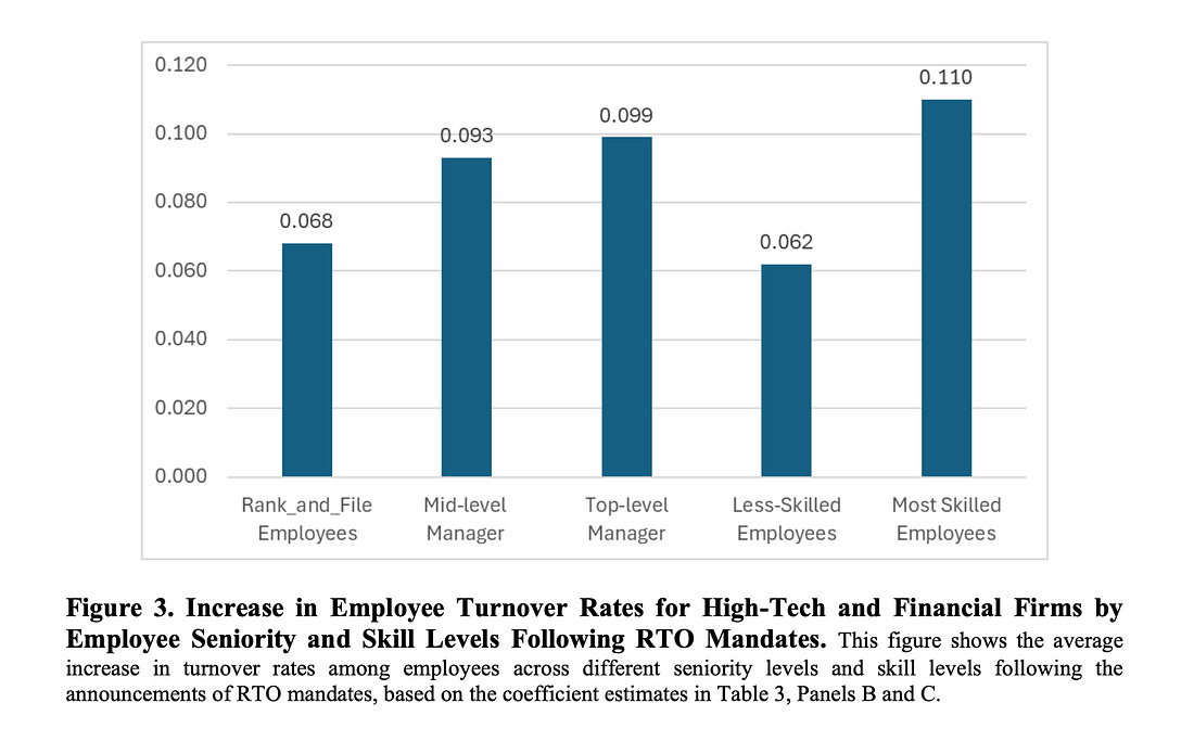In other words, leaders at companies that used to work in-office in the pre-pandemic era seem to have abundant evidence that the shift to remote work has been a major driver for company underperformance (not their leadership!), and are now taking their responsibilities by bringing everyone’s asses back. While it’s true that nowadays the public discourse and research funding seem to be only interested in one degenerate aspect or another surrounding the so-called revolution of GenAI, a few mighty researchers out there are still stubbornly dedicated to exploring the space of RTOs and their measurable impact. Let’s see a couple of interesting studies Return to Office Mandates and Brain DrainThe abstract from a study from December 2024 (revisited in September 2025), eloquently titled Return to Office Mandates and Brain Drain¹ states the following: