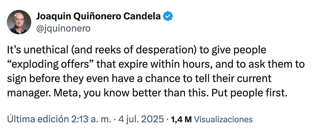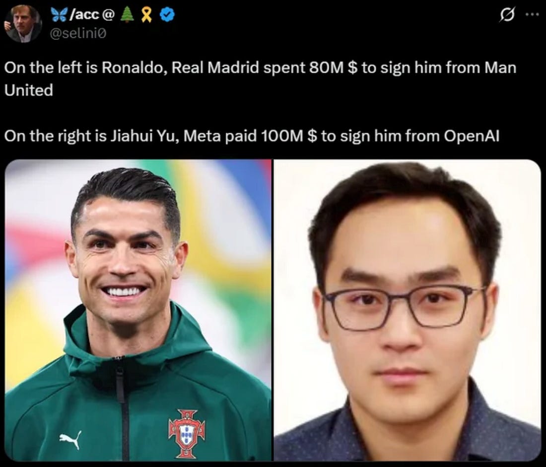 Además de esta lista, Zuck también ha pagado más de 14.000 millones de dólares por el 49% de Scale AI, y ha puesto a su CEO, Alexander Wang, al frente del nuevo departamento de Superinteligencia de Meta. Le acompañará también Nat Friedman, ex-CEO de Github y hasta ahora CEO de Safe Superintelligence, la startup del ex-fundador de OpenAI, Ilya Sutskever. ¿Son los investigadores en IA son las nuevas estrellas del deporte?El meme a continuación ha sido una de las razones que esté escribiendo este artículo. A un lado, Cristiano Ronaldo, por el que el Real Madrid pagó 80 millones en su momento. A la derecha, Jiahui Yu, por quién Meta ha pagado 100 millones esta semana. Cristiano Ronaldo no fue uno de los galácticos de la primera época de Florentino, pero igual podría estar Figo o Zidane en esa imagen. Lo importante es que por primera vez desde que tengo conciencia, he visto fichar a empleados a golpe de talonario como si fueran auténticas estrellas del deporte. Y eso, en cierto modo, me reconforta con la raza humana. Siempre se dice que a las estrellas del deporte se las contrata en parte por los ingresos que son capaces de generar. Bajo ese prisma, tiene todo el sentido del mundo que aquellos investigadores capaces de cambiar el mundo y generar enormes cantidades de valor para sus empresas, cobren el equivalente de aquellos que sólo dan patadas a un balón. Zuck ha abierto la caja de Pandora. Una caja que, estoy seguro, muchos otros CEOs hubieran preferido que siguiera cerrada. Por ejemplo, Sam Altman, CEO de OpenAI criticaba abiertamente la estrategia de Meta, y aprovechaba para anticipar los problemas culturales que la misma podía causar. Lo que no deja de resultar irónico, después de comprar la empresa de Jony Ive y Windsurf, por 6.500 y 3.000 millones respectivamente. OpenAI, que planea perder 7.000 millones este año, ya ha anunciado que revisará los sueldos de sus empleados. Y es que no ha tenido tiempo ni de reaccionar al ataque depredador de Zuck. El Head of Recruiting de OpenAI, Joaquín Quiñonero, se quejaba amargamente de la jugada del CEO de Meta. Al parecer, las ofertas de Meta tenían un plazo de expiración de ¡horas! El fracaso de los galácticosPocos lo recuerdan ya, pero Florentino Pérez dimitió en 2006 hastiado de su proyecto galáctico, lamentándose por haber mimado en exceso a sus jugadores. Y es que, el Madrid de los Galácticos terminó siendo un equipo absolutamente descompensado, lleno de estrellas pero con poco espíritu de equipo y sacrificio. ¿Pasará lo mismo en Meta con su equipo de Superinteligencia? ¿Qué ocurrirá con sus actuales investigadores que han sacado adelante sus modelos Llama? ¿Cuánto aguantará Yann LeCun trabajando a las órdenes de un jovencísimo Alexander Wang? Más aún. ¿Cuál es el horizonte temporal del equipo? Los avances en investigación son lentos. Los investigadores de hoy, están mirando a los avances que veremos dentro de cinco años. ¿Tendrá paciencia Zuck o acabará como Florentino renegando de su equipo? ¿Cómo reaccionará el resto de la industria? Parece claro que Zuck ha conseguido incrementar los costes en personal de toda su competencia. ¿Tienes un investigador destacado que lidera tu proyecto? Más te vale bañarle en oro porque Zuck ha puesto precio a aquellos que están trabajando por redefinir la frontera del conocimiento humano. Zuckerberg no sólo ha fichado talento. Ha cambiado las reglas del juego. Nunca apuestes contra Zuck. |