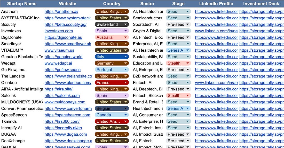 121 startup applications. Fill out THIS FORM to boost your funding round, and Ruben Dominguez Ibar & I will do our best to help you!If you're a business angel or VC and would like to see the list of startups, leave a comment below or scroll to the end of this post. I will provide an analysis of 3 early-stage startups building global solutions in the UK, Switzerland, and the US, 2 of which are founded by Spanish entrepreneurs.π HQ: London, UK π«° Business model: Enterprise SaaS: annual per-user or per-site licensing. π HQ: Austin, TX, USA π«° Business model: SaaS, B2C, B2B π HQ: Zurich. π«° Business model: Annual subscriptions for scouts and freemium for football fans. Would you consider investing in System Stack, Anathem, or Scoutify?π€ ASK ME if you want my personal feedback (POSITIVE FACTORS & CONCERNS)β If youβd like to be featured in my next blog post, or recurrent access to the list of startups, let me know!If youβre not premium subscriber yet, youβre missing out! Sign up now to unlock: