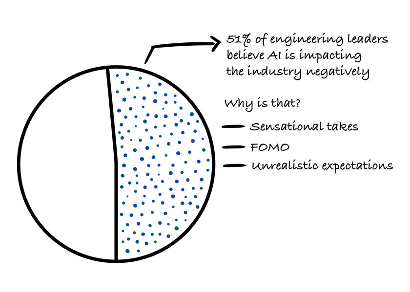 No shiny AI tools can make the overall organization more productive than a great culture. These 2 articles and the recording of my talk at the Infoshare Conference in Katowice are relevant to this: Now, let’s talk about the next impactful thing, and that is the negative sentiment regarding AI in our industry. 2. The Negative Perception Regarding AI Was Caused by THISThe second really important finding that made a mark on everyone in the engineering industry is the negative perception regarding AI from both engineering leaders and engineers. I was going through the report where 600+ engineering leaders shared their views on AI and how it impacts individuals and teams, and two findings really made me wonder. The two findings are: