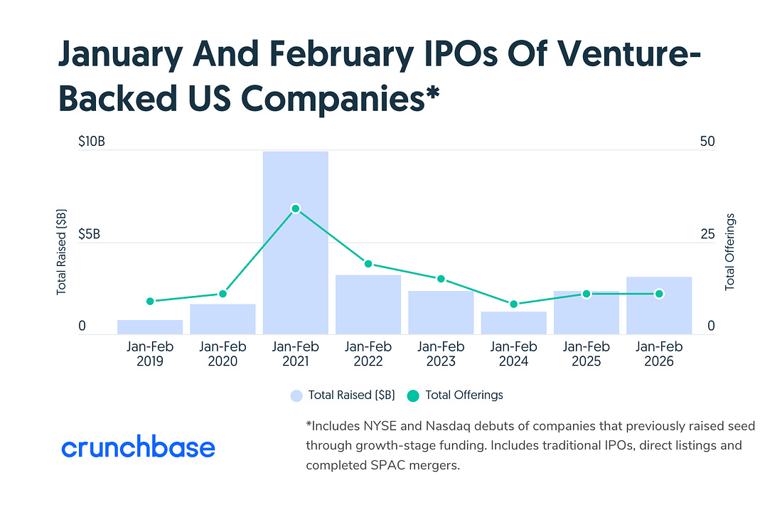 Operaciones de M&AStripe expresa interés en la adquisición total o parcial de su rival PayPal. La clave: Stripe no tiene marca directa al consumidor. Y además el momento por el que pasa la cotizada en bolsa lo hace una buena oportunidad económica ($41.000M de valoración). Uber adquiere la plataforma SpotHero para integrar reservas de estacionamiento en eventos, estadios y aeropuertos dentro de su ecosistema. Sin datos del precio. Anthropic adquiere Vercept para integrar herramientas de agentes capaces de ejecutar tareas complejas en aplicaciones. Sin datos del precio. Salidas a bolsaCross River Bank prepara su salida a bolsa tras seleccionar a los bancos colocadores para un debut que marcaría la primera OPV de un banco respaldado por capital riesgo en años. Tiene a a16Z, Battery Ventures o Ribbit Capital entre sus socios. Cerebras Systems (fabricante de chips de IA) presenta de nuevo su solicitud confidencial de salida a bolsa. Busca debutar en abril. La finlandesa IQM saldrá a cotizar con una SPAC. Alcanza una valoración de $1.800M en su proceso para convertirse en una de las primeras empresas de computación cuántica en cotizar en Europa. Y sobre el mercado: según Crunchbase (ver gráfico más abajo), en 2026 se han ejecutado 11 salidas a bolsa que recaudan $3.000M pese a la sequía en el sector SaaS. El inversorGeneral Catalyst compromete $5.000M de inversión en India para los próximos cinco años, multiplicando su apuesta previa tras la fusión con Venture Highway. Thrive Capital (Joshua Kushner) multiplica por seis el valor de su fondo de 2011. Blue Owl enfrenta dificultades financieras tras una caída del 30% en sus acciones y un aumento en las solicitudes de reembolso de sus inversores. Seraphim Space supera su objetivo de €84M tras el cierre de su fondo especializado en espacio. Lanzamientos, fichajes y otras historiasLa oleada de secundarios y ventas de acciones de empleados no sólo no cesa, sino que se intensifica (mientras las potenciales salidas a bolsa siguen posponiéndose):