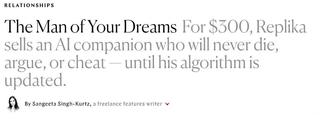 Weekly writing about how technology and people intersect. By day, I’m building Daybreak to partner with early-stage founders. By night, I’m writing Digital Native about market trends and startup opportunities. If you haven’t subscribed, join 70,000+ weekly readers by subscribing here: Lessons from Sci-FiThe film Her came out in 2013, but the story is set in 2025. Turns out, Her was pretty prescient. In the year 2025, thousands (millions?) of people have romantic relationships with AI chatbots. These chatbots don’t have Scarlet Johansson’s voice—though they almost did!—but the rest is spot-on. NSFW chat was one of the first killer use cases for AI. We’ve written about this extensively in Digital Native—AI Friends Are a Good Things, Actually (April 2025); Maslow’s Hierarchy of Startups (March 2023)—and many publications have done deep-dives into the world of AI romance. One example headline from a 2023 piece in The Cut: (The TL;DR: many people fell in love with their Replikas, then were left grieving when Replika banned NSFW chat 😕.) Even today, nearly three years since ChatGPT’s launch, AI companions and “spicy” chat continue to feature heavily in the top AI applications: