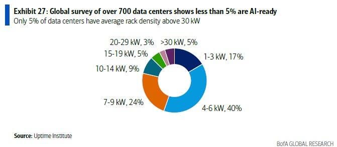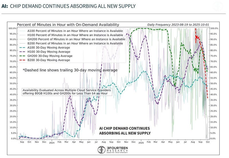 But as many as 95% of data centers built for cloud computing may struggle to meet the power demands of new generation AI chips, according to BofA. A single AI rack will draw up to 600kW by 2027 (up from ~50-120 kW/rack today). This boom is creating new scarcities. Electricity now costs 267% more than it did five years ago in areas near a major data center in the US, fueling backlash as residents subsidize corporate power demand. Another one is the ongoing demand for close-to-obsolete GPUs. Take Nvidia’s A100, five years after it was first launched, and even after its successor has begun shipping, is harder to get today than it was in 2020. Prices are rising and depreciation schedules are extending from three years to six years. New supply is being snapped up.