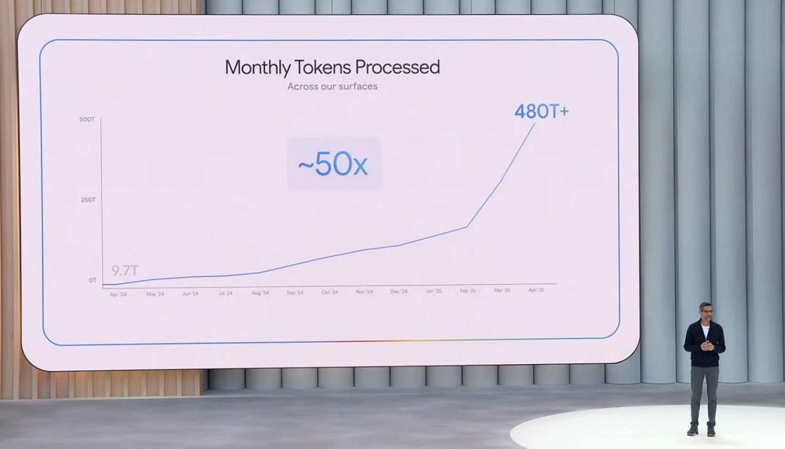 Ravenous reasoning agentsGoogle’s inference load soared 50-fold in just 12 months, from 10 trillion tokens in April 2024 to 480 trillion in April 2025. More users played a role, but the bigger driver is the rise of reasoning models, which consume about 17 times as many tokens as predecessors because they run long internal chains of thought.