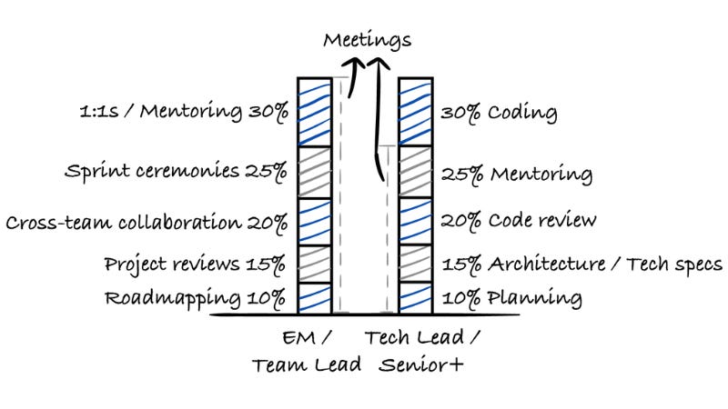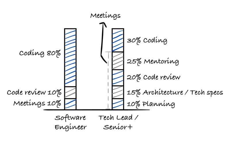 And for the bonus, I also shared resources that I recommend for becoming a great Tech Lead in 2025 and beyond. Here are a few pictures: And today, I am doing a recap of the talk! This is an article for paid subscribers, and here is the full index: - What is a Tech Lead and What Do They Do? Let’s start! What is a Tech Lead and What Do They Do?Firstly, before we dive into why a Tech Lead role is becoming one of the most important roles in tech, it’s important to define what the role actually means. The funny thing here is that if you were to ask 100 companies to define what a Tech Lead is, you’d get 100 different answers. So, this picture below is on point :) Now, let’s get to my definition of what a Tech Lead means to me. A Tech Lead is someone who is responsible for the technical implementation of the specific project. They create a technical specification, collaborate with a product manager on the planning of the project, and manage expectations of the project with the stakeholders. Normally, they also estimate the effort that is going to be needed and provide the specific timeline, and also what the specific iterations of deliverables are going to be. So, Tech Leads are basically the go-to people for the tech side of the project, and they are responsible for ensuring everything goes well. It’s a totally different role than the role of a Software Engineer → you do a lot less coding and you act as a multiplier for others. Unblocking and helping others to progress and move forward with their tasks is what becomes very important. Now, let’s head on to the differences between roles. Differences Between a Software Engineer, Tech Lead (Senior+), Team Lead/EMThese are really great visual presentations of the main differences between roles and how each of the roles spends their time daily. Make sure to keep in mind that every company has the % differently, but this is the best estimation. SWE and Tech Lead (Senior+): EM/Team Lead and Tech Lead (Senior+): People management and Technical direction: Now that we know what a Tech Lead is and the differences between the roles, let’s head on to why a Tech Lead is becoming an increasingly important role in tech. Tech Lead is Becoming an Increasingly Important Role due to GenAIThe main reason for this is:... Subscribe to Engineering Leadership to unlock the rest.Become a paying subscriber of Engineering Leadership to get access to this post and other subscriber-only content. A subscription gets you: