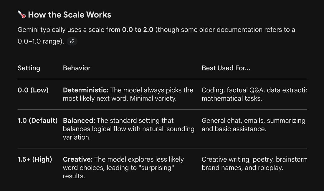 In GeminiGemini describes Temperature as a dial between predictability and imagination. You can’t adjust Temperature in the standard consumer Gemini web app (gemini.google.com). Why? In Pro Search, Gemini often performs multiple searches and internal "thinking" steps. Google manages the temperature dynamically during this process, for example, it might use a Temperature of 0.0 while extracting data from a webpage, but a 1.0 while writing the final summary.” To manually force temperature in Gemini, you have to use Google AI Studio or the Gemini API. 🛠️ How to Adjust ItIf you want to play with this setting, you should use Google AI Studio: