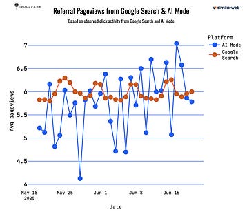 6. AI Mode clicks less often but engages just as muchSimilarweb partnered with iPullRank to dive into Google’s new AI Mode, tracking over 100K AI Mode users from May 20 to June 19. They discovered a big disparity in click-through rate. Only 4.5% of sessions in AI Mode lead to an external click, compared to 24% in traditional search. That’s a steep drop in potential traffic. This is partly because AI Mode answers feel more “complete”, but also because the UI buries links, and early adopters seem more in a play around and explore mode than transact.
