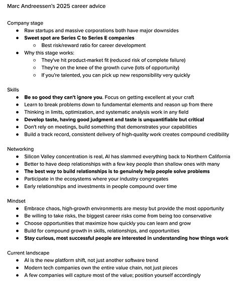 4. What’s happening to middle management?James Stanier lays out how the role of engineering managers is being redefined…and not gently. If you’re leading a team, or planning to, this is a sharp, practical read. Managers are now being asked to justify their existence. One line sums it up: “Headcount is a liability until proven otherwise.” That’s the current mindset inside many companies. Hiring someone isn’t seen as progress unless you can clearly show how that person (and yourself) will increase output. There’s less budget, fewer layers, and more pressure to ship. This new environment favors managers who stay close to the work: writing code, building prototypes, launching MVPs, and using AI tools to move faster. It’s more about proving progress fast than about long roadmaps or polished decks. Stanier argues that managers today need to think more like operators than facilitators. For anyone building a team, whether in product, ops, or engineering, this is a helpful snapshot of what the new normal looks like. Read → New Advice for Aspiring Managers. 5. Marc Andreessen’s cheat sheet for navigating 2025Marc Andreessen shared this no-frills career advice recently, and while it’s aimed at individuals, much of it applies directly to founders and team builders as well. It’s a useful snapshot of how people are thinking about risk, roles, and where to position themselves in a fast-moving landscape. A few highlights: