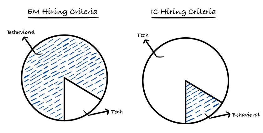 Why EM Interviews Are DifferentThe EM role is fundamentally different from IC work, and so is the hiring process. As an IC, technical competence is your primary currency. As an EM, it's about translating business needs to technical execution while growing people and managing complexity. While you'll still face technical rounds (system design, possibly DSA), these are just filters – minimum bars you must meet. The real decision happens in behavioral interviews, which typically account for ~80% of the hiring criteria. What are hiring managers actually looking for?