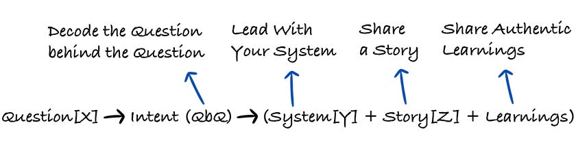These aren't just nice-to-have qualities → they're essential for the role. An EM who lacks emotional intelligence will struggle to retain talent. One without resilience will burn out during the first major incident. Without extreme ownership, they'll lose credibility with both their team and stakeholders. You need to demonstrate these characteristics through convincing stories, not just claim you possess them. That’s how you land an EM offer. Why Most EMs Get RejectedThe common failure patterns I see repeatedly: Under-preparation → Many candidates assume their experience speaks for itself. They show up thinking, "I've been an EM for 3 years, I should be fine." But without preparation, even experienced leaders give rambling, unfocused answers. IC mindset → They prepare for an IC interview, focusing on technical solutions rather than leadership decisions. They talk about the code they wrote instead of the team they guided. Missing the intent → They focus on surface-level details instead of leadership lessons. When asked about conflict resolution, they spend 80% of their time explaining the technical disagreement and 20% on how they managed the people involved. Generic "we" language → They constantly say "we decided" or "our team did" without clarifying their specific role. Interviewers are left wondering: What did YOU actually do? Perfectionism trap → They only share stories with perfect outcomes, which makes them seem either dishonest or lucky. Real leadership involves navigating failures and learning from them. Rigid script mentality → They memorize answers but can't adapt when asked follow-up questions or variations they haven't practiced. 2. The EM Interview FormulaHere's the structure that consistently impresses interviewers: Question[X] → Intent (QbQ) → (System[Y] + Story[Z] + Learnings) This formula works because it mirrors how great EMs actually think: