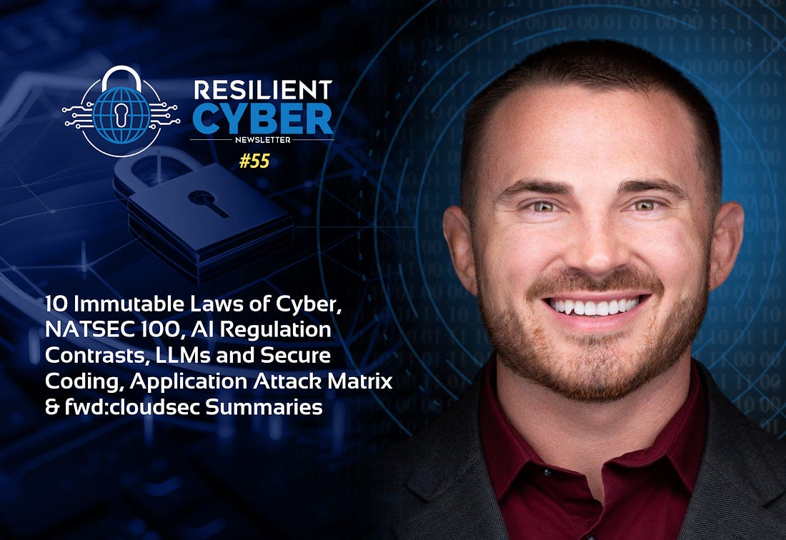 Resilient Cyber Newsletter #5510 Immutable Laws of Cyber, NATSEC 100, AI Regulation Contrasts, LLMs and Secure Coding, Application Attack Matrix & fwd:cloudsec Summaries