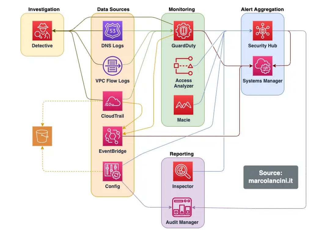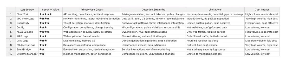 From AWS Detection Deficit to Detection MaturityBuilding robust and effective detection capabilities in leading CSPs such as AWS can be a complex endeavor, even for the most capable teams. This incredible blog detailing how one team identified their AWS detection deficits and matured them while diving deep into AWS log sources and telemetry is helpful for any security practitioner securing workloads in AWS. The below image helps highlight the AWS services involved, both from a data source, monitoring, and aggregating perspective. The author lays out an AWS Log Source Security Summary: They discuss how they built out detections and enriched log sources with additional information such as network context and threat intelligence, where possible, to provide deeper insights. Their journey captures key lessons as well: