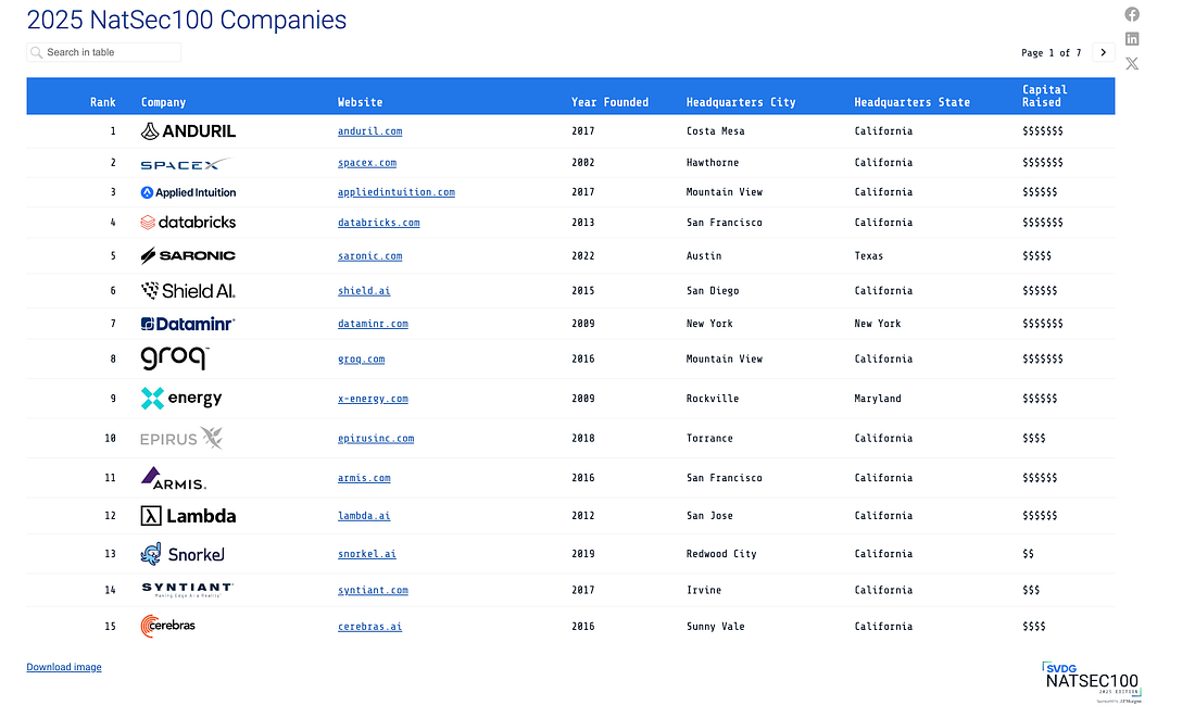 Silicon Valley Defense Group (SVDG) NATSEC 100 - 2025 EditionI spend a fair amount of my time focused on the public sector, including DoD, due to my role as the Co-Founder and CEO of a Public Sector-focused digital services firm, Aquia. That’s why the SVDG NATSEC 100 caught my attention this week. Produced in partnership with JP Morgan, it provides insights into the top 100 venture-backed, dual-use, and defense technology companies focused on national security. The report cites in 2024 they saw a ~2.3x increase in prior year spend by the DoD on NatSec 100 companies, which isn’t too surprising for those paying attention, as the current administration had a strong backing from silicon valley and venture capital as well as a mandate to try and disrupt the status quo in terms of primes and vendors. The report also points out that this still accounts for <1% of the total DoD budget, emphasizing just how dominant the traditional DoD primes are. Another interesting anecdote is that they offer their analysis and dataset with and without SpaceX, due to its outsized funding, as well as its outsized Government contracts compared to the rest of the NatSec 100, which again for those following politics, could be an interesting thing to keep an eye on given the tension between President Trump and Elon. Below is a snapshot of some of their key stats/findings: Also, the top 15 companies ranked: The report is worth reading if you’re interested in and passionate about the DoD market from a technology and capital perspective. AIAI Patchwork Quilt of Regulation ForthcomingAs part of the recent “Big Beautiful Bill,” a 10-year moratorium (e.g., a ban) on state-level AI compliance and regulation was proposed, but it was recently struck down and removed from the bill's version that passed. This is a dynamic topic that has valid arguments in both directions. On one hand, AI is too immature and evolving to be regulated effectively. Efforts to do so could hinder innovation and lead to economic and national security consequences for the U.S. (and others). On the other hand, it could be argued that we need a comprehensive, cohesive compliance regime to avoid a patchwork quilt of state-level regulations that will be costly and cumbersome for businesses to navigate and impose challenges and impacts on consumers. Citizens of different states/nations could be constrained regarding what innovative AI services, products, models, etc., they can access. We’re headed for that patchwork quilt, as the 10-year state-level ban was removed from the passed bill. Many states have already ushered in one or more AI regulatory requirements that businesses must now navigate. This topic, as discussed in major news outlets such as AP and many others, involves many dynamics and angles, from differences between the two parties to big techs pushing for the moratorium, to states looking to assert their rights to regulate. In the absence of a coherent Federal-level AI regulatory regime, states are expected to step in, much like they’ve done with privacy here in the US. The AI Regulatory Moratorium Fails: What Comes Next?In the wake of the 10-year regulatory moratorium failing, some have penned strong opinions on what will happen next. This includes Adam Thierer, who details some of the policy and even national security and economic implications in this piece. Adam makes three primary arguments: