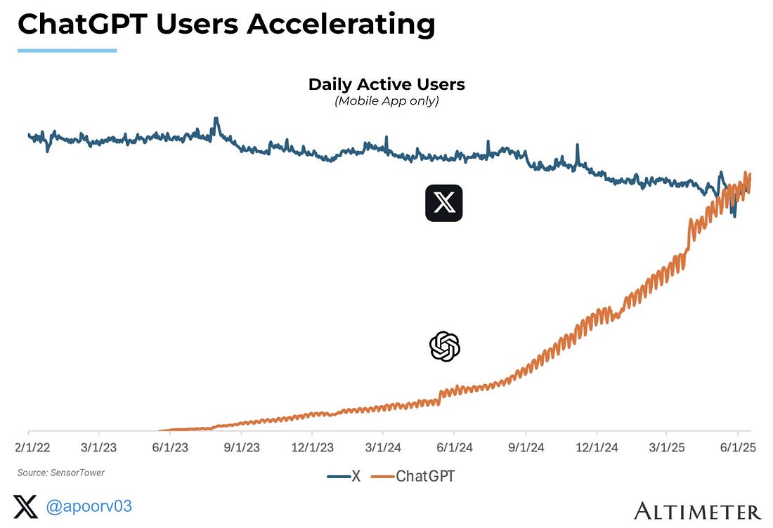 ChatGPT app surpasses X. In just 2.5 years, ChatGPT’s mobile app has overtaken X (formerly Twitter) in daily active users.