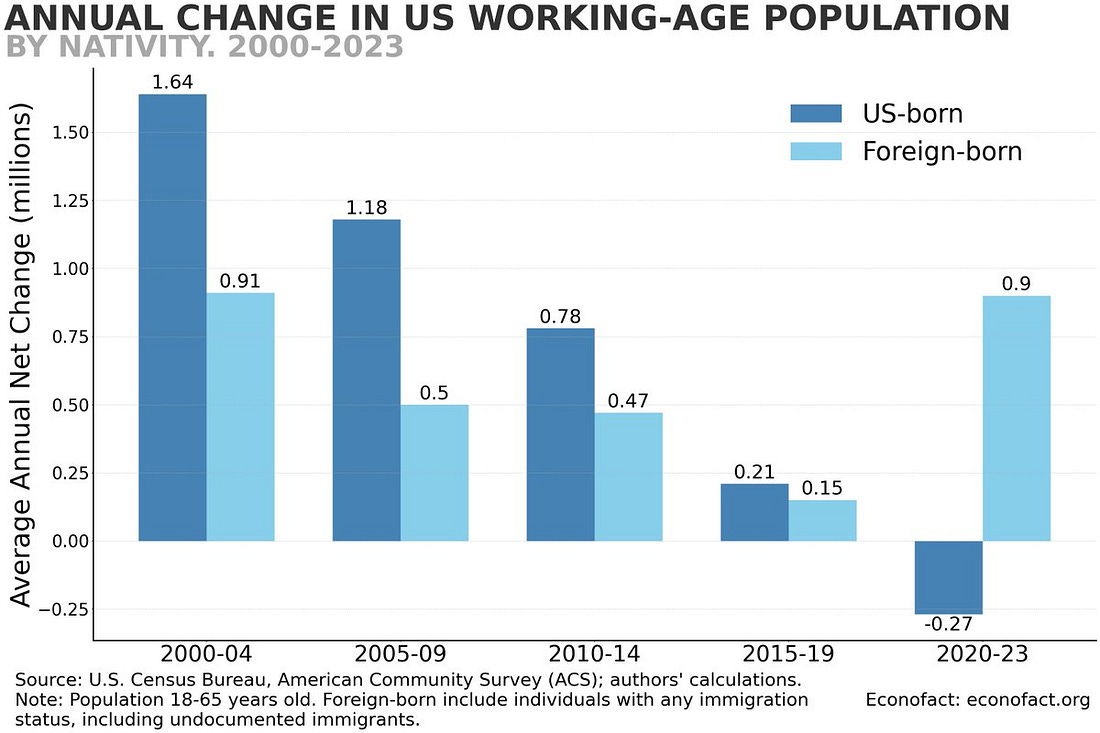 US depends on immigration. New census data shows the US-born workforce is declining, meaning future labor growth relies on up-skilling and immigration to secure necessary labor.