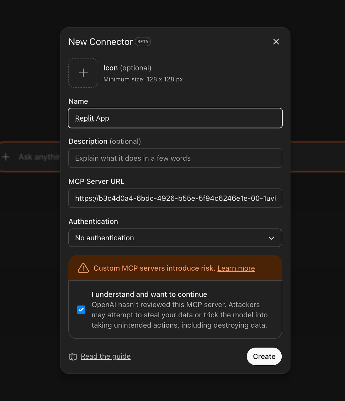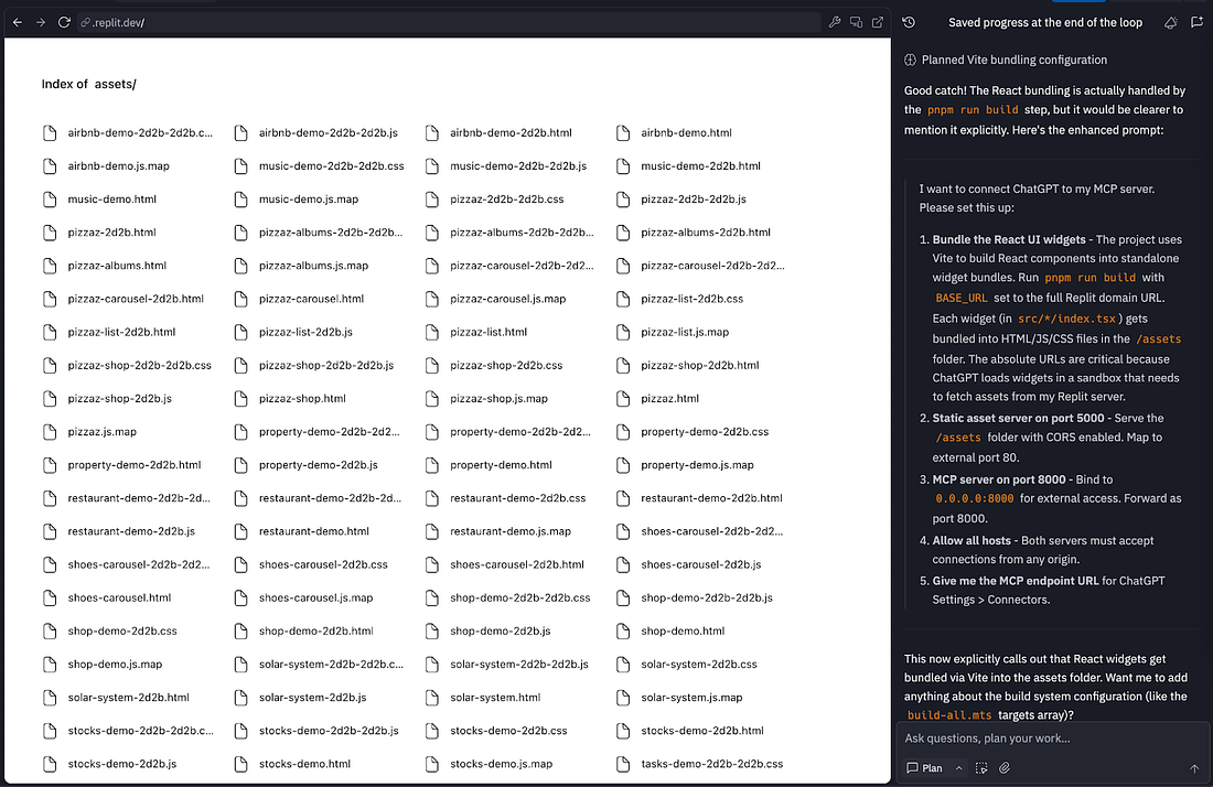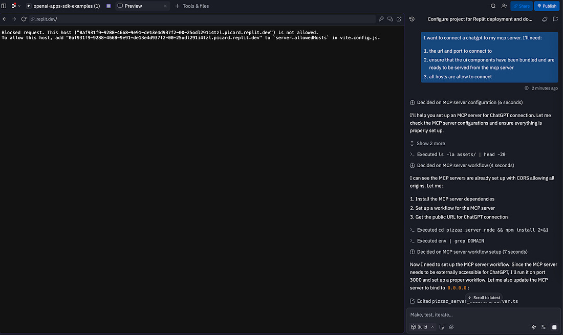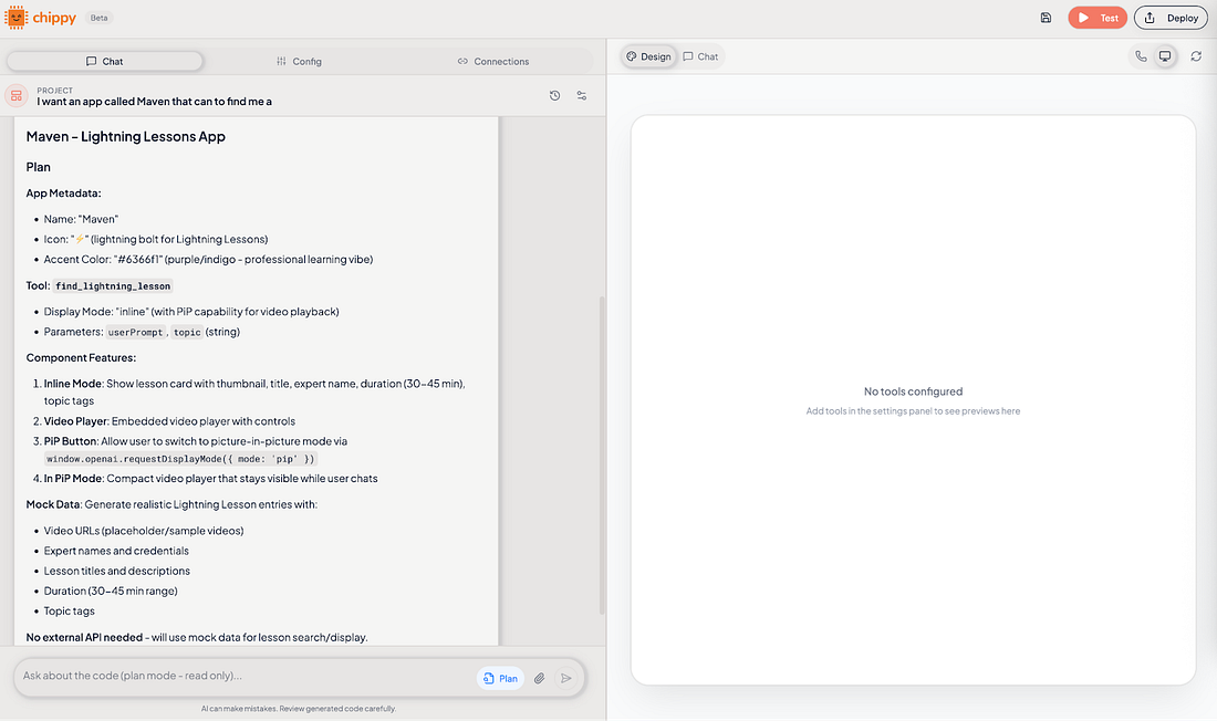 You may see a screen that appears to be an error, like the screenshot below. Replit is not built to preview MCP tools, so you’ll only be able to see the UI components once you’re connected to ChatGPT. Allow Replit to continue working until it has set up the MCP server correctly. Eventually the Replit agent should tell you it’s ready. Common issues include misconfiguring ports and not being able to serve static assets, so follow up on these as needed. When ready (or if you copied my project), you should be presented with a screen like this: We’re now ready to connect to ChatGPT. Ask the agent, “What is the external MCP URL for this app?” This should provide a URL like https://b3c4d0a4-6bdc-4926-b55e-5f94c6246e1e-00-1uvko22a6cltw.spock.replit.dev:8000/mcp. To connect to ChatGPT, you will first need to enable Developer Mode on your ChatGPT account. From there, you can navigate to Settings -> Apps & Connectors -> New App. Paste your URL in this modal with a name (e.g. Replit App). Once connected, you should be able to invoke the app by name: Option 2: ChippyMost vibe-coding tools aren’t built to help you understand MCP and ChatGPT apps. They’re great at building web apps, but they can’t create an MCP server, preview your tools, or help you connect to ChatGPT. That’s why I decided to build one myself—Chippy. Chippy is an AI agent that specializes in prototyping ChatGPT apps. You can test your app with the built-in chat, connect to ChatGPT without worrying about deployment, and even generate a spec directly from your prototype. And you can spin up your first app completely free. In this example, I’ll build an app that lets users search Maven Lightning Lessons (free 30-minute talks from experts on AI, product, and design). The core features are: