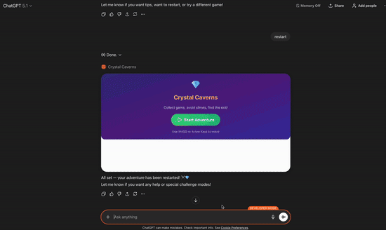 To start, I’ll head to Chippy.build and ask Chippy to help me plan this project. Chippy suggests a single tool called find_lightning_lesson that takes a topic as input. It will then show an inline card to start, with an option to change to picture-in-picture. From here, we just need to tell Chippy to implement. We can then get a preview of our app and test how it will work inside a chat environment. We now have a functional ChatGPT app ready to test. Before we continue, grab your app link with “Test” in the top right corner To connect to ChatGPT, you will first need to enable Developer Mode on your ChatGPT account. From there, you can navigate to Settings -> Apps & Connectors -> New App. Add a Name, MCP Server URL, and set Authentication to No auth. Once you click Create, you’ve successfully made your first ChatGPT app! The most reliable way to test your app is to mention it by name or tag it in your own chat. Below you can see that ChatGPT automatically tags your app if you mention it by name. Once you have a functional app, you can continue to iterate and begin to build a golden set of prompts to trigger your app. You may want to add authentication, fetch real data out of your product, or build apps that use multiple tools together. ChatGPT apps don’t have to be as simple as showing a video or displaying a card. You can build full, complex applications directly into ChatGPT. Here’s a quick example of a dungeon explorer game I built with Chippy. You can see that ChatGPT has context on my current level, information about the game, and can give me tips on improving my score. The growth opportunity in front of you right now...Subscribe to Lenny's Newsletter to unlock the rest.Become a paying subscriber of Lenny's Newsletter to get access to this post and other subscriber-only content. A subscription gets you: