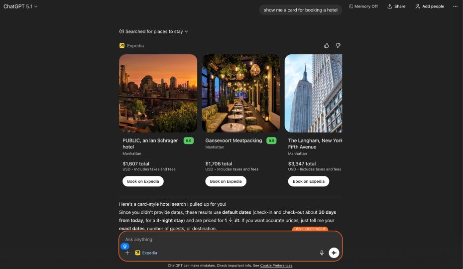 ChatGPT apps are about to be the next big distribution channel: Here’s how to build oneA step-by-step guide to jumping in and building your first ChatGPT app👋 Hey there, I’m Lenny. Each week, I tackle reader questions about building product, driving growth, and accelerating your career. For more: Lennybot | Lenny’s Podcast | How I AI | Lenny’s Reads | Favorite AI and PM courses | Favorite communication course Subscribers get 19 premium products for free for one year: Lovable, Replit, Gamma, n8n, Bolt, Devin, Wispr Flow, Descript, Linear, PostHog, Superhuman, Granola, Warp, Perplexity, Raycast, Magic Patterns, Mobbin, ChatPRD, and Stripe Atlas (terms apply). Subscribe now. My many-time collaborator—and author of my 2nd and 12th most popular posts of all time—is back, and it’s a banger. If you’re looking for alpha in growing your product, this post is for you. I’ll keep my intro short and get you right into the post. For more from Colin, find him on LinkedIn, check out his killer course, and join this free Lightning Lesson on January 30th to get a hands-on, live look at building your first ChatGPT app. P.S. You can listen to this post in convenient podcast form: Spotify / Apple / YouTube. A few months ago, if you asked ChatGPT to help you book a flight to Paris, you’d get a helpful list of recommendations: airline breakdowns, price ranges, maybe some tips on timing. Then you’d leave ChatGPT, open a travel site, and start your search from scratch. Now you can say, “Help me find a good flight to Paris from Toronto,” and an interactive widget appears directly inside your conversation. You browse flight options, compare prices, and book, all without ever leaving the chat. The strategy is simple: instead of ChatGPT responding with text and sending the user elsewhere, it will now surface interactive widgets from third-party apps directly in a conversation, letting users transact inside of ChatGPT (and over time, OpenAI will likely take a small percentage of the transaction). Launched in October at Dev Day, partners for ChatGPT’s apps already include large companies like Adobe, DoorDash, Canva, Figma, Booking.com, Coursera, Expedia, Spotify, and Zillow. Some of the biggest companies in the world are betting that chat will become a primary interface for their products. ChatGPT apps represent a rare distribution opportunity, the kind that comes around once or twice a decade. The last comparable moments were the App Store in 2008, the rise of SEO in the early 2000s, and maybe Shopify’s app ecosystem. When a new distribution channel opens up at scale, the companies that move early capture habits that are hard to break later. This creates opportunity at both ends of the spectrum. For enterprises, ChatGPT apps are a new distribution channel alongside your existing ones. For solopreneurs, this is a chance to build microapps and get distribution without a marketing budget. The barrier to entry is low (a few weeks to build a simple app), but the reach is enormous. In this post, I’ll break down how users find and use your apps, how these apps work behind the scenes, and how to create your own first ChatGPT app. Let’s build. How users find and use ChatGPT appsChatGPT apps introduce interaction patterns that differ from traditional app stores. In most app stores, you have to find the app, install it, and only then you can use it. ChatGPT does support this pattern, but the more interesting pattern is contextual surfacing. In the near future (and something most people don’t fully grasp), ChatGPT will automatically suggest apps based on a user’s conversation. Ask about travel plans, and Expedia appears. Mention that you need a design, and Canva surfaces. Ask about ordering groceries, and an Instacart cart shows up. A user doesn’t need to know what apps are available; the model matches their intent to relevant tools. This has the potential to be a new and massive growth channel for products. ChatGPT apps can appear in three formats, and as an app builder it’s important for you to consider which format would match the type of app experience you want to create for the user. I’ll say more about this in a bit, but each type leverages the Model Context Protocol (MCP) to deliver your app to ChatGPT. Inline mode embeds cards and lists directly in the conversation flow. This is the default, and it works well for product listings, search results, or any content that fits naturally alongside ChatGPT’s responses. Here’s a quick example of hotel listings from Expedia: Fullscreen mode takes over the entire screen. This is best for maps, dashboards, or complex workflows that need more space. When a user is browsing AllTrails on a map or editing a design in Canva, full screen gives them room to work. Picture-in-picture mode keeps a small floating window visible while the user chats. This is ideal for music players, timers, or anything a user might want to keep running in the background while they work on something else. Here, Coursera is playing a video while I continue chatting. There’s one important constraint to understand: one widget per message. If the user says, “Book a restaurant and order an Uber,” ChatGPT can show only one app at a time. This means users work sequentially through multi-step tasks rather than in parallel. How it works behind the scenesWhen you’re preparing to build a ChatGPT app, it’s important to first understand the architecture. Every ChatGPT app has three parts: