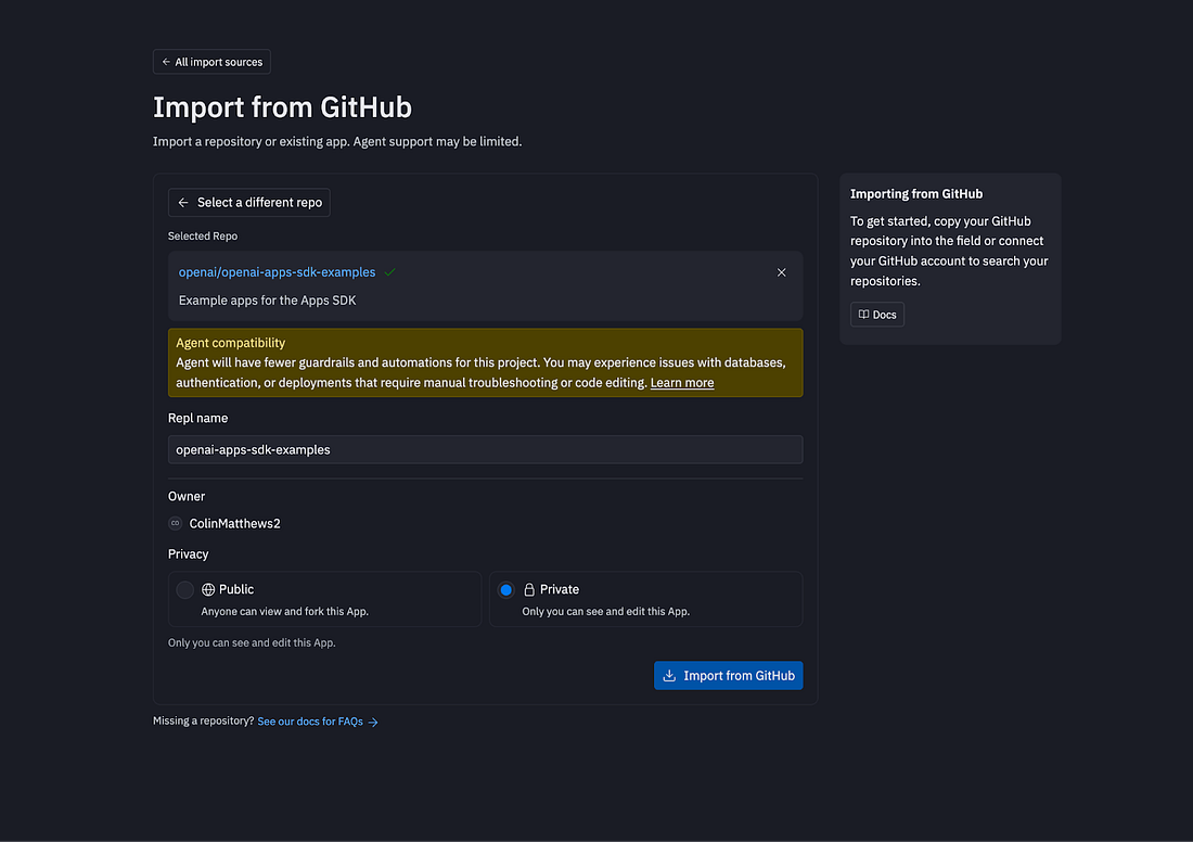 Let’s dig into #2, the app’s tools, because that’s the core of how this works. A tool is just a function that ChatGPT can call. When you build an app, you define tools, like search_restaurants, book_ticket, or create_playlist. Each tool has a name and description that helps ChatGPT understand when to use it and what parameters it accepts. When a user says something relevant, ChatGPT reads these descriptions and decides which tool to call. Here’s the flow: The user says, “Find me Italian restaurants in Brooklyn.” ChatGPT looks at the available tools, sees one called search_restaurants with a description like “Search for restaurants by location and cuisine” and calls it with {location: “Brooklyn”, cuisine: “Italian”}. Your server runs the search, returns the results, and can optionally include a widget to display them. ChatGPT renders the widget in the chat with the user. The user interacts with the widget—say, by clicking on a restaurant to reserve it. That click can trigger a follow-up tool call. Your widget then sends a message back to ChatGPT saying, “User selected restaurant_id: 1241,” and ChatGPT can call another tool, like book_reservation(), to save their reservation. The conversation continues, with the widget and the AI working together. This creates a loop: user says something to ChatGPT → ChatGPT calls a tool → widget renders → user interacts with widget → ChatGPT calls another tool. The key insight is that ChatGPT orchestrates the whole thing. It decides when to call tools, what parameters to pass, and how to respond to user actions. Your app just exposes capabilities and renders UI. MCP is the infrastructure connecting all of this. MCP is very similar to APIs (I covered those here), but rebuilt for AI agents. It provides a universal way to connect apps to AI assistants. Anthropic created MCP in November 2024, and OpenAI adopted it across ChatGPT and their developer tools in March 2025. In November, both companies announced they’re collaborating on MCP Apps, a standardized way to add interactive UIs to the protocol. If you’ve heard of AI agents, this might sound familiar. ChatGPT apps and AI agents share the same core pattern: an AI model that can call external tools to accomplish tasks. The difference is who’s running the show. When you build your own AI agent, you control everything—the model, the prompts, the orchestration logic, the error handling. You decide when tools get called and how results are processed. As you may have been thinking as you read this, tools also represent a new form of SEO (or is it AEO?). Based on your tool’s name and description, ChatGPT can suggest your app to users to help solve their needs, like creating a slide deck or generating a financial model. Having accurate tool descriptions that uniquely identify your app will help ChatGPT users find and use your app in the correct contexts. Building your first ChatGPT appNow that you understand the basic structure, you can have an app built in 30 minutes or less by following this guide. Option 1: ReplitThe Replit agent is not an expert on ChatGPT apps, so the easiest way to get started in Replit is to import an existing app. I’d recommend the official examples from OpenAI. To save some time, I created a Replit project you can duplicate with all of the following steps completed, here. I’d highly recommend using my project; it will likely save you at least 30 minutes. If you’d prefer to start from scratch, head to Replit, select “Import from GitHub,” and paste in this URL: https://github.com/openai/openai-apps-sdk-examples The Replit agent will then do some work to set up your project—it should take 5 to 10 minutes. Once you have the project running, you should prompt the following: