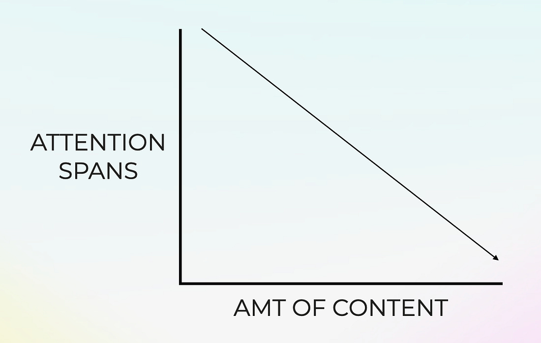 A timely example of how challenging the “resource” of attention is to mine and maintain: The Late Show with Stephen Colbert has been leading in Late Night since the 2016 election. But the show has still lost a third of its audience in that time. When CBS announced last week that it will cancel Colbert—ending a 33-year run of The Late Show, which started with David Letterman in 1993—reports emerged that the show was losing $40M a year (!). A $40M / year loss is a pretty shocking figure for a leading TV institution. What happened? TikTok ate Late Night. We’re consuming content in bite-sized videos; young people don’t have the attention spans for 30-minute episodes of TV (and if they do, they’re scrolling their little screens while watching things on their big screens). Gen Z now spends a whopping 108 minutes per day on TikTok—nearly two hours. We can see here the steady march of digital video gobbling up our waking hours: We added an hour from 2021 to 2025, a +33% increase. Sure, software ate the world—but so has content. Industries are adapting to our TikTok brains. The Guardian ran this headline last week: Warner Bros. seemed to run a TikTok-optimized campaign for Superman. Audiences got to know David Corenswet not through long-form interviews (or Late Night!), but through short-form video snippets designed to go viral. This trend isn’t going anywhere: there’s a direct negative correlation between the amount of content out there and our attention spans. We’re already swimming in content, and we’re about to get a lot more. AI-generated video is getting very good. Take Google’s Veo 3 model. Here’s an IKEA ad that someone on Twitter made using Veo 3: Damn. This would cost ~$100K to produce without AI. Or take Decart, which has developed a model called Mirage that manipulates live video in real time. It’s worth playing around with Mirage on Decart’s site. The product is impressive: you can turn any video, game, or camera feed (think: your Zoom meeting) into a new digital world, in real time. Here’s a video I exported of me playing with Mirage. You can see my real video in the corner, while the main videos shown are real-time generations as I toggle between styles like “Frozen Wonderland,” “Relaxing Anime,” and “Zombies!!”. In contrast to most video models that create short clips, Mirage allows continuous streaming for live video. Expect to see this everywhere; Twitch will never be the same. The point is: the amount of content out there is going to swell even further, which means, per the chart above, shorter attention spans. It also means the price of attention will go up. There’s a positive correlation here: As the amount of content increases, attention becomes a scarcer and scarcer resource, thus becoming pricier. We’re left with two options. Monetize attention: